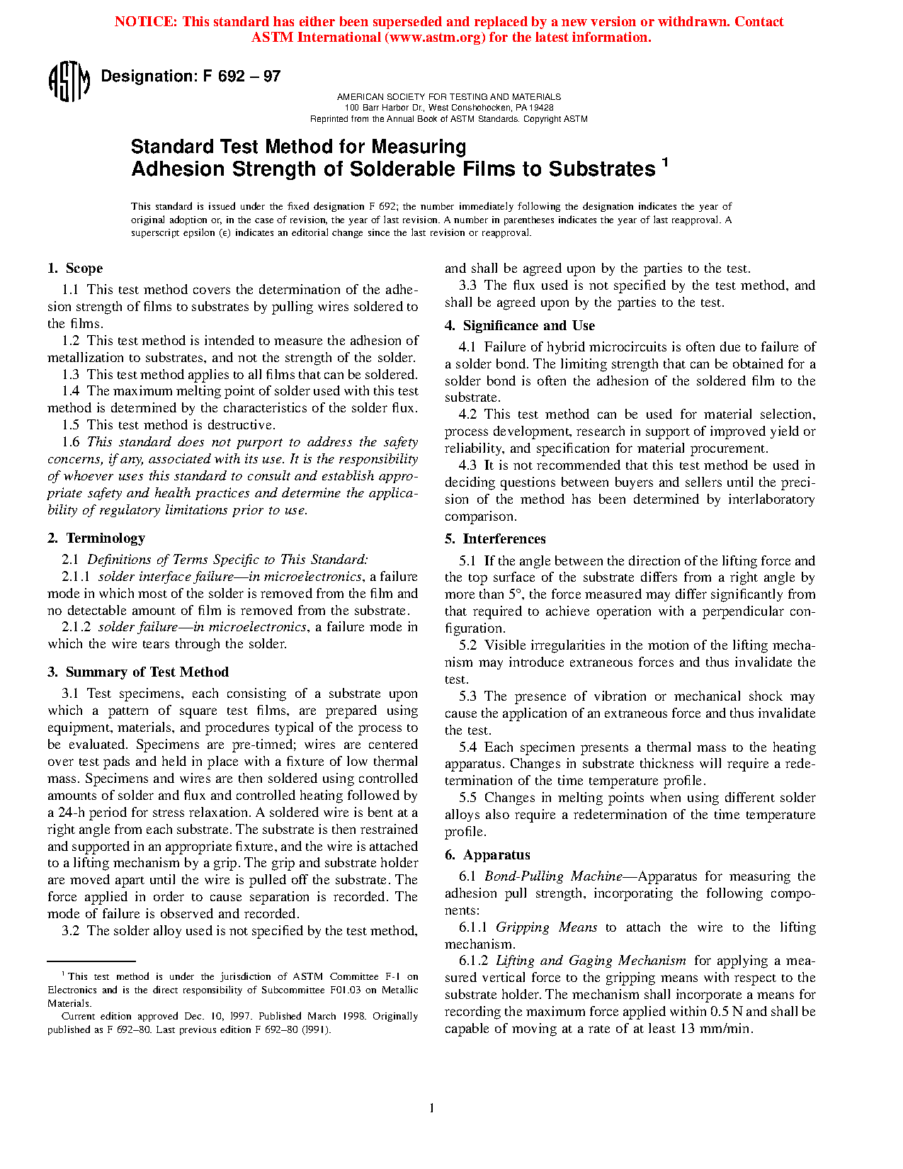 1.1 This test method covers the determination of the adhesion strength of films to substrates by pulling wires soldered to the films.