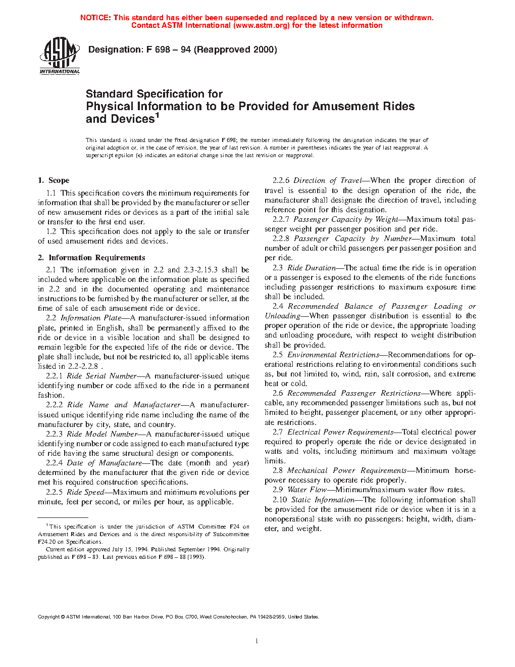 1.1 This specification covers the minimum requirements for information that shall be provided by the manufacturer or seller of new amusement rides or devices as a part of the initial sale or transfer to the first end user.