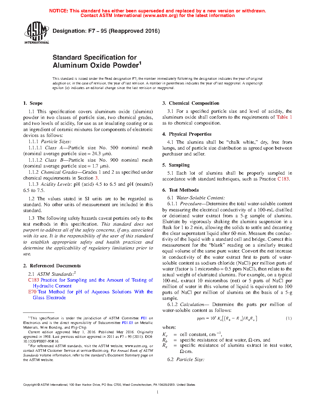 1.1 This specification covers aluminum oxide (alumina) powder in two classes of particle size, two chemical grades, and two levels of acidity, for use as an insulating coating or as an ingredient of ceramic mixtures for components of electronic devices as follows: