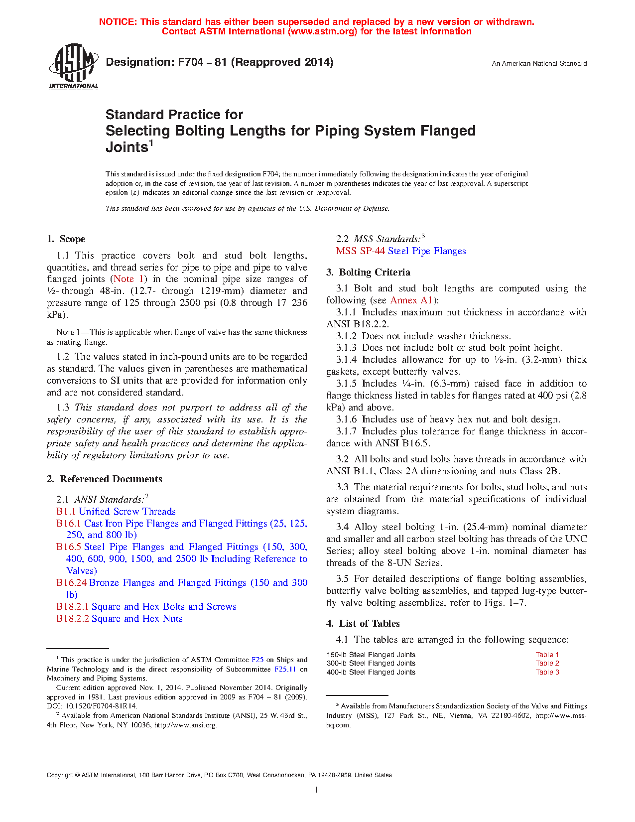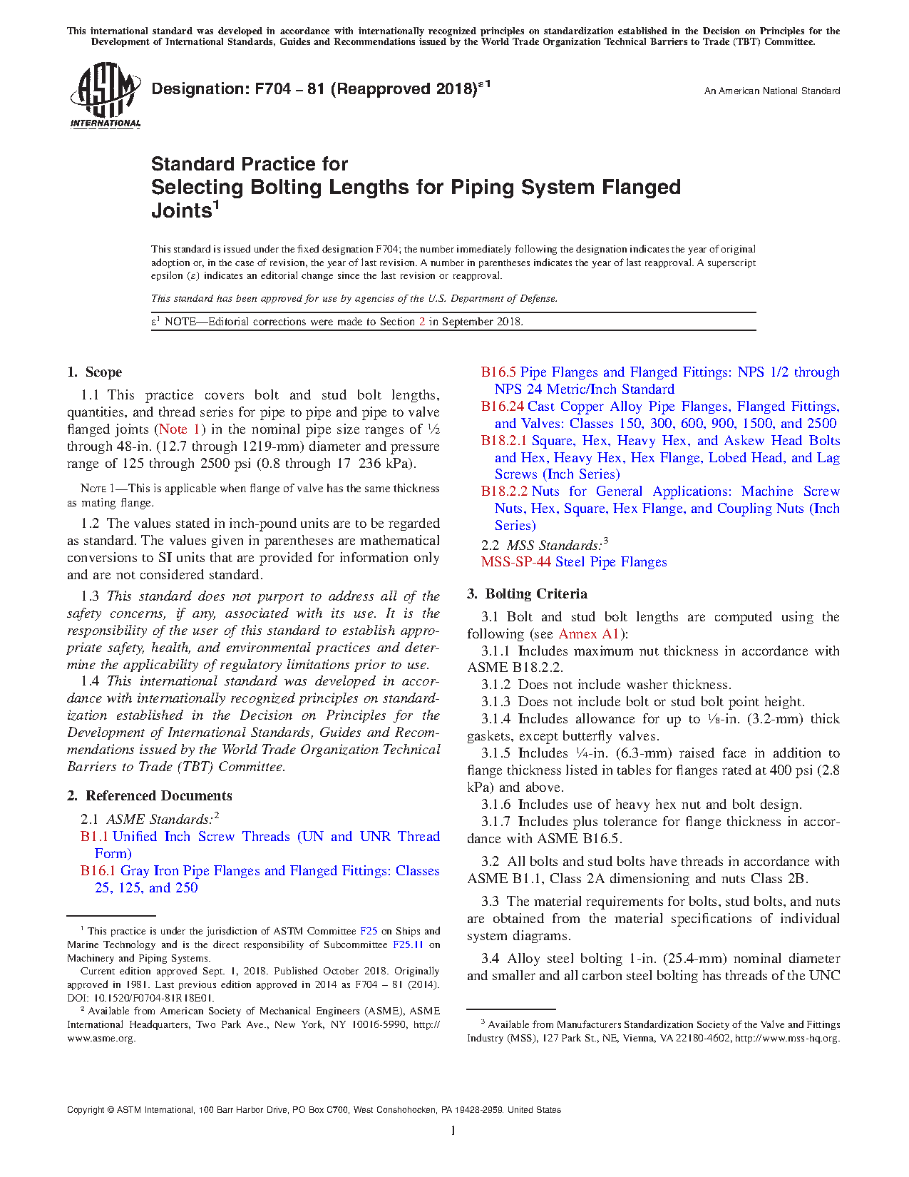 1.1 This practice covers bolt and stud bolt lengths, quantities, and thread series for pipe to pipe and pipe to valve flanged joints (Note 1) in the nominal pipe size ranges of ½ through 48-in. (12.7 through 1219-mm) diameter and pressure range of 125 through 2500 psi (0.8 through 17 236 kPa).