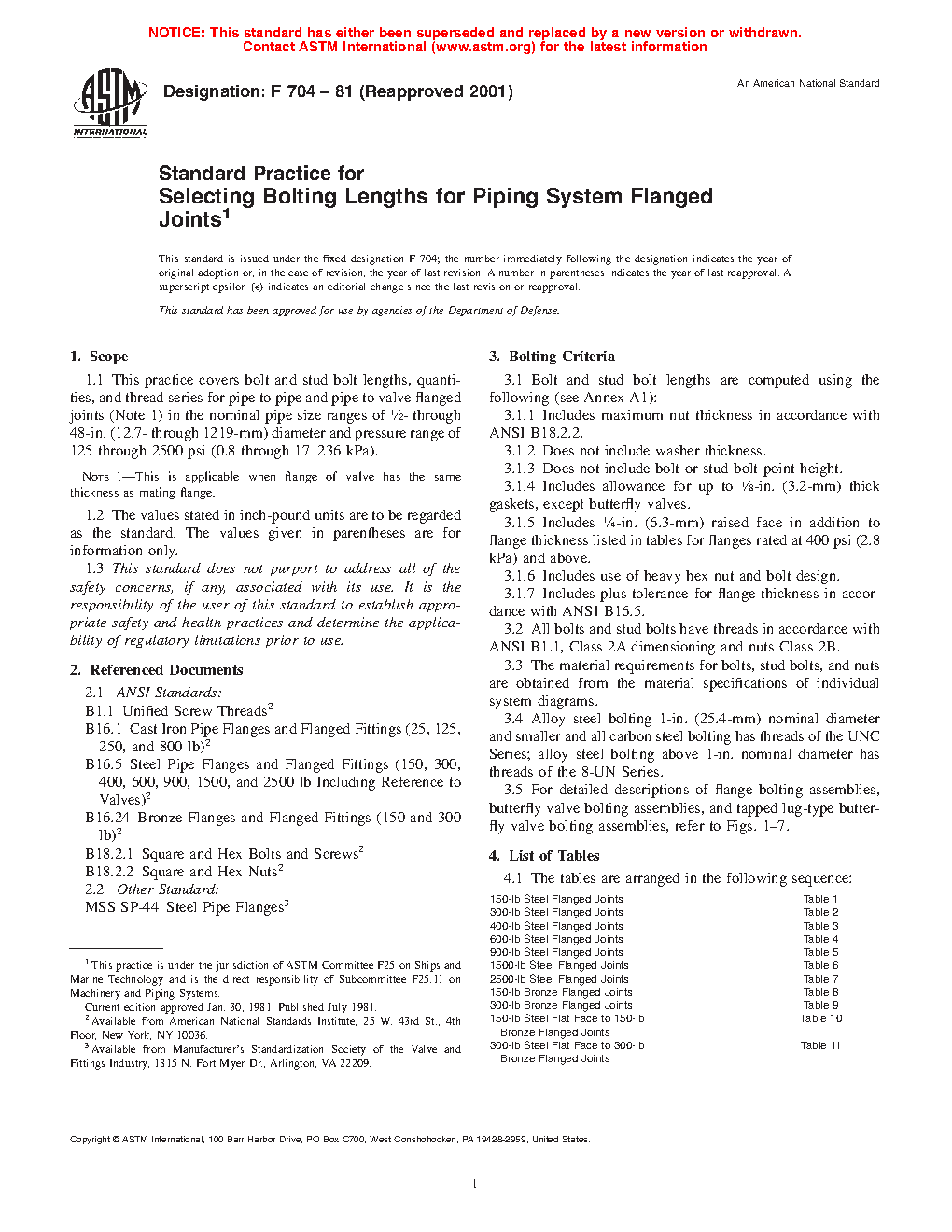 This practice covers bolt and stud bolt lengths, quantities, and thread series for pipe to pipe and pipe to valve flanged joints. This specification presents tables of bolting lengths for different steel flanged joints.