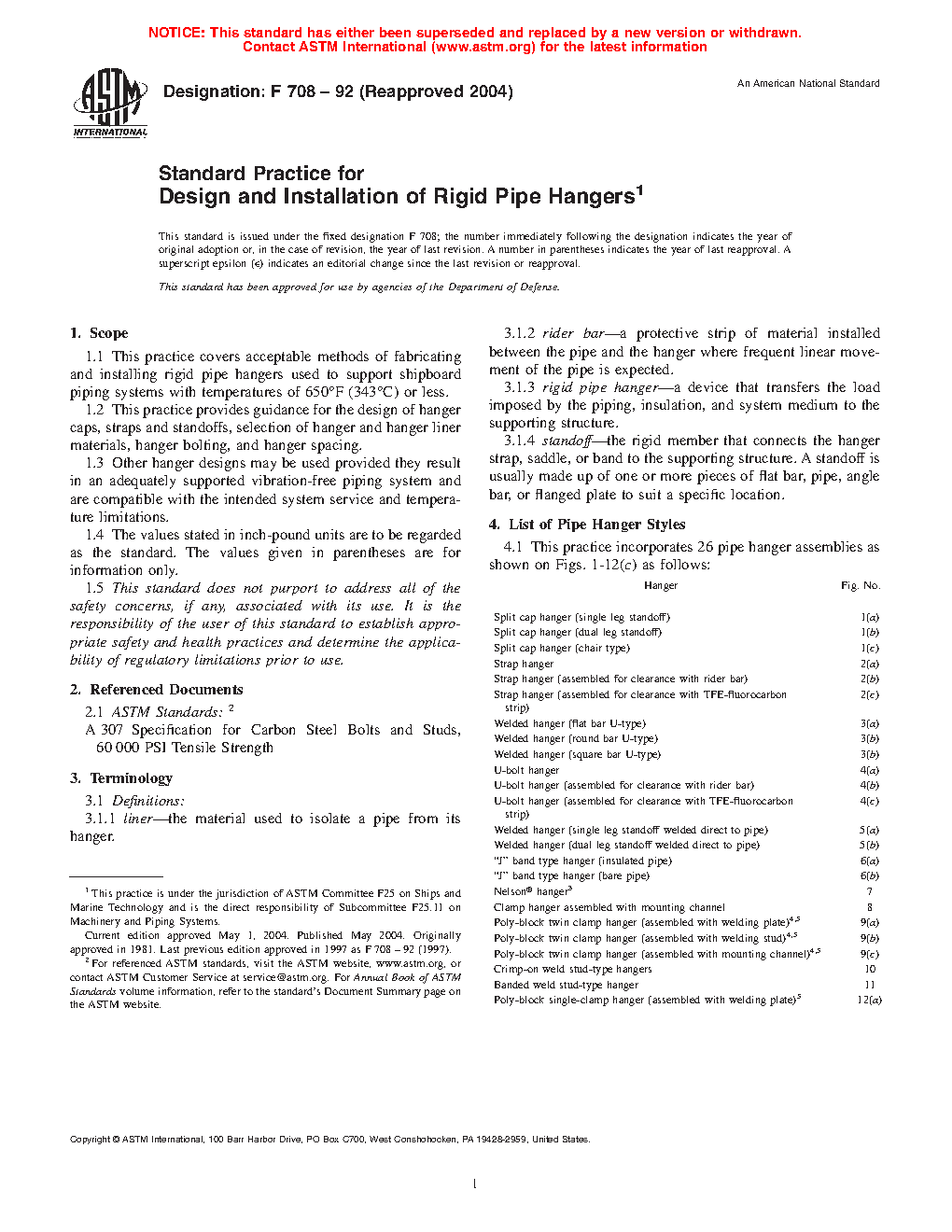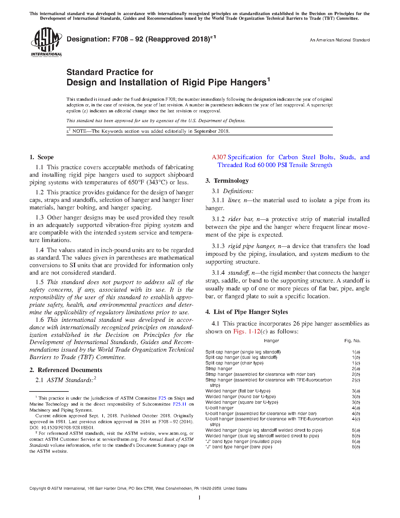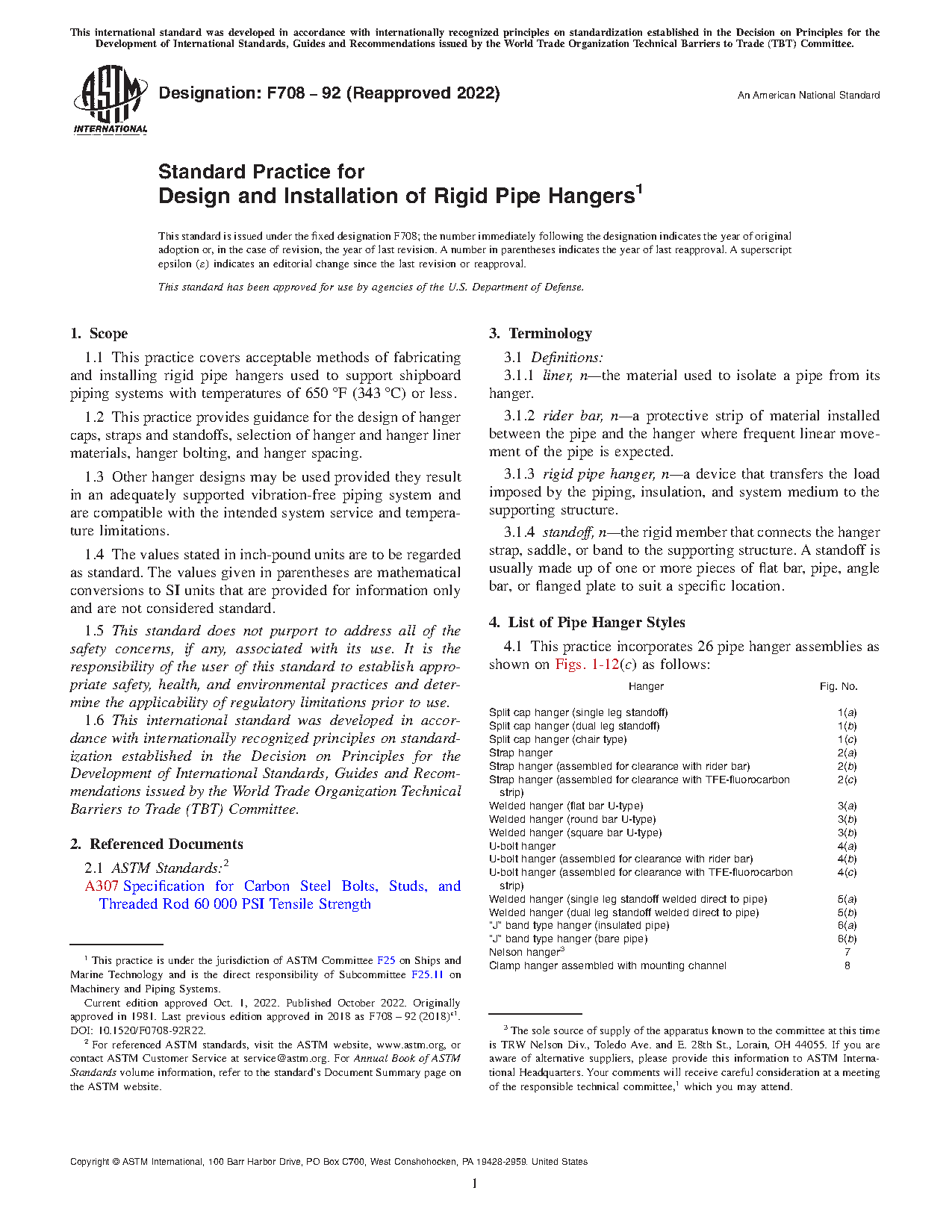 1.1 This practice covers acceptable methods of fabricating and installing rigid pipe hangers used to support shipboard piping systems with temperatures of 650 °F (343 °C) or less.