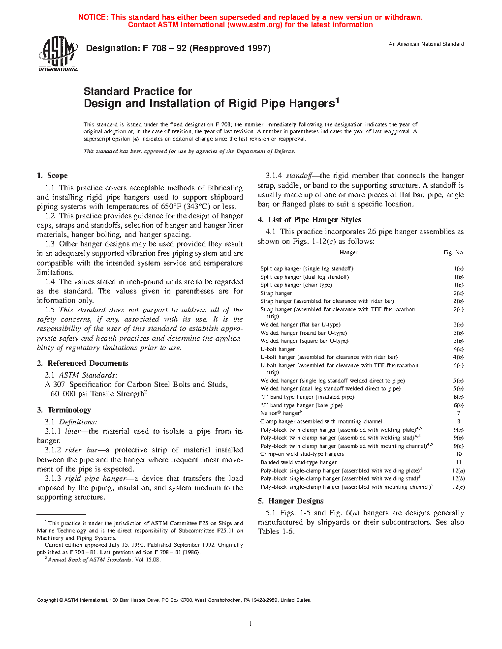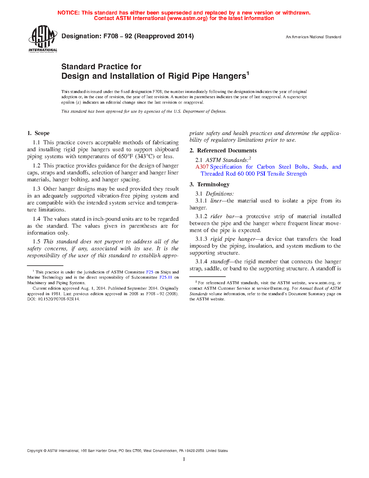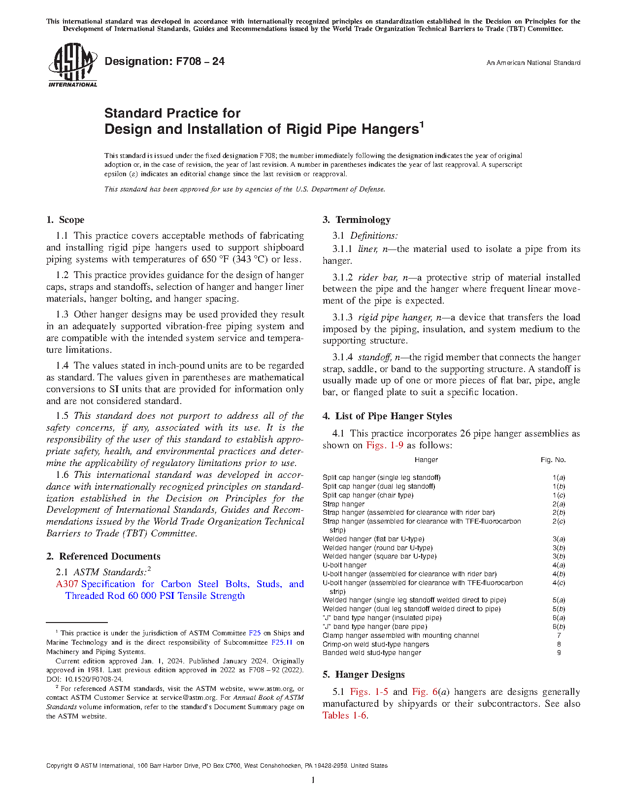 1.1 This practice covers acceptable methods of fabricating and installing rigid pipe hangers used to support shipboard piping systems with temperatures of 650 °F (343 °C) or less.