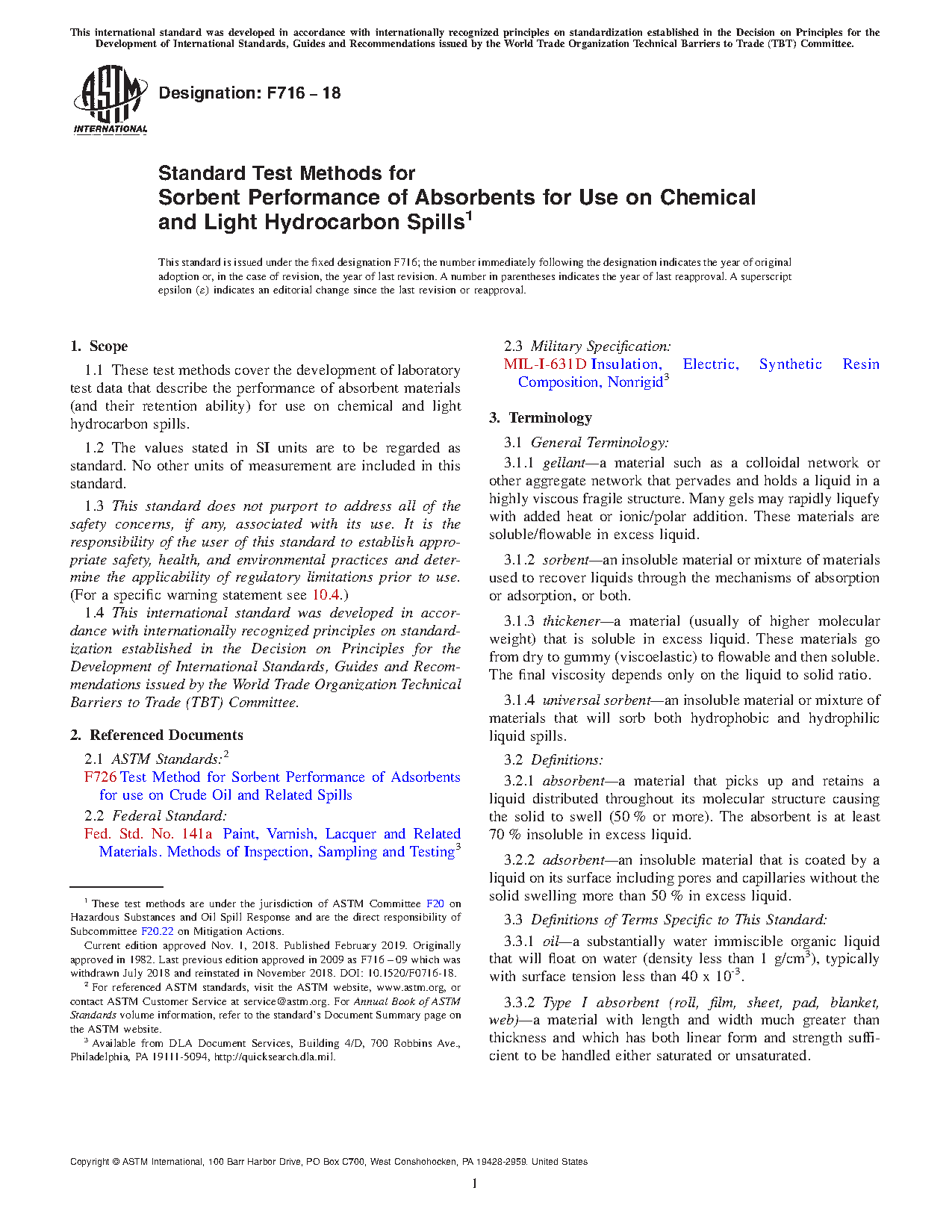 1.1 These test methods cover the development of laboratory test data which describe the performance of absorbent materials used to remove oils and other compatible fluids from water.
