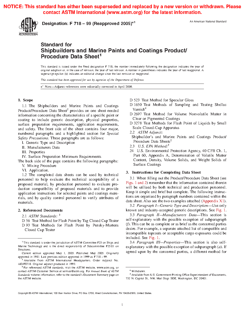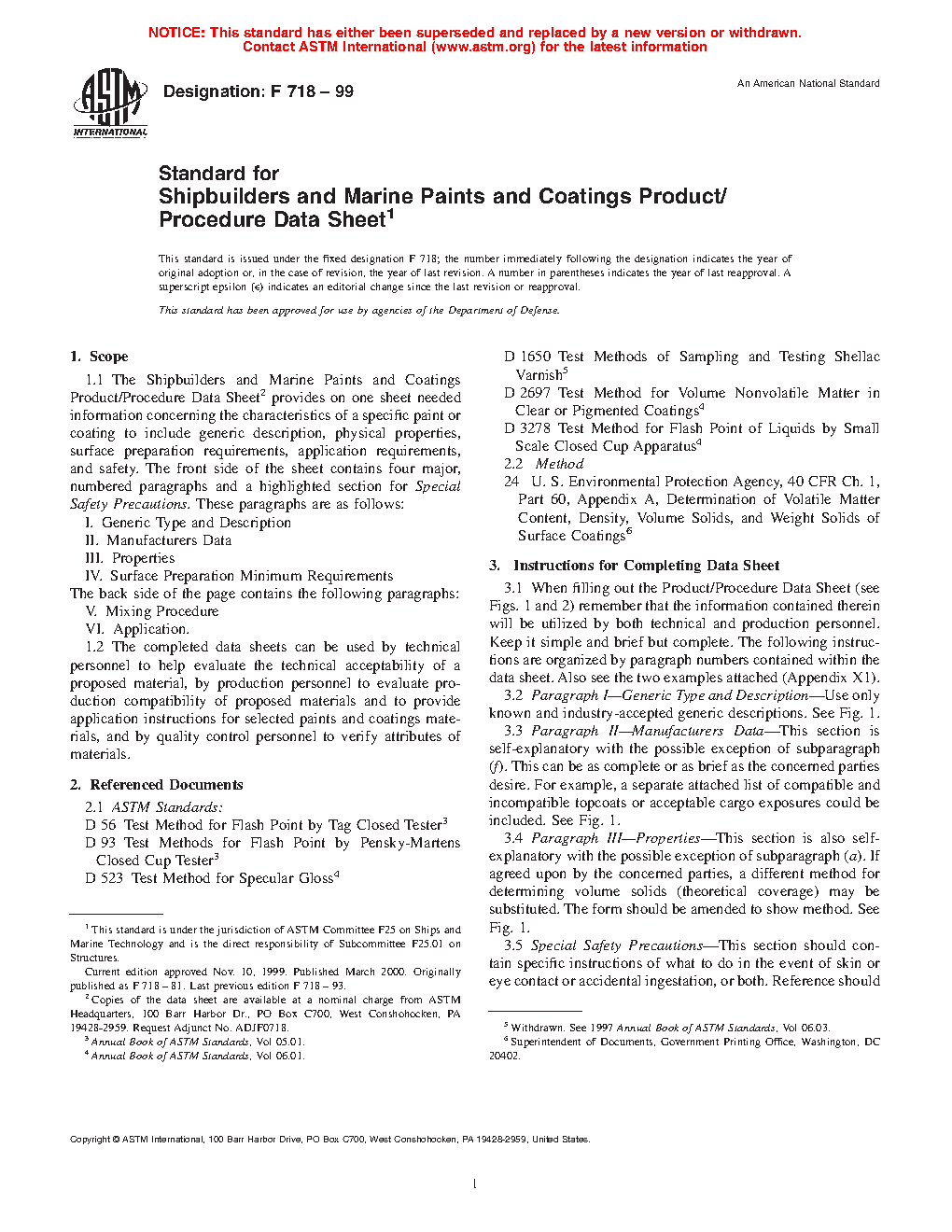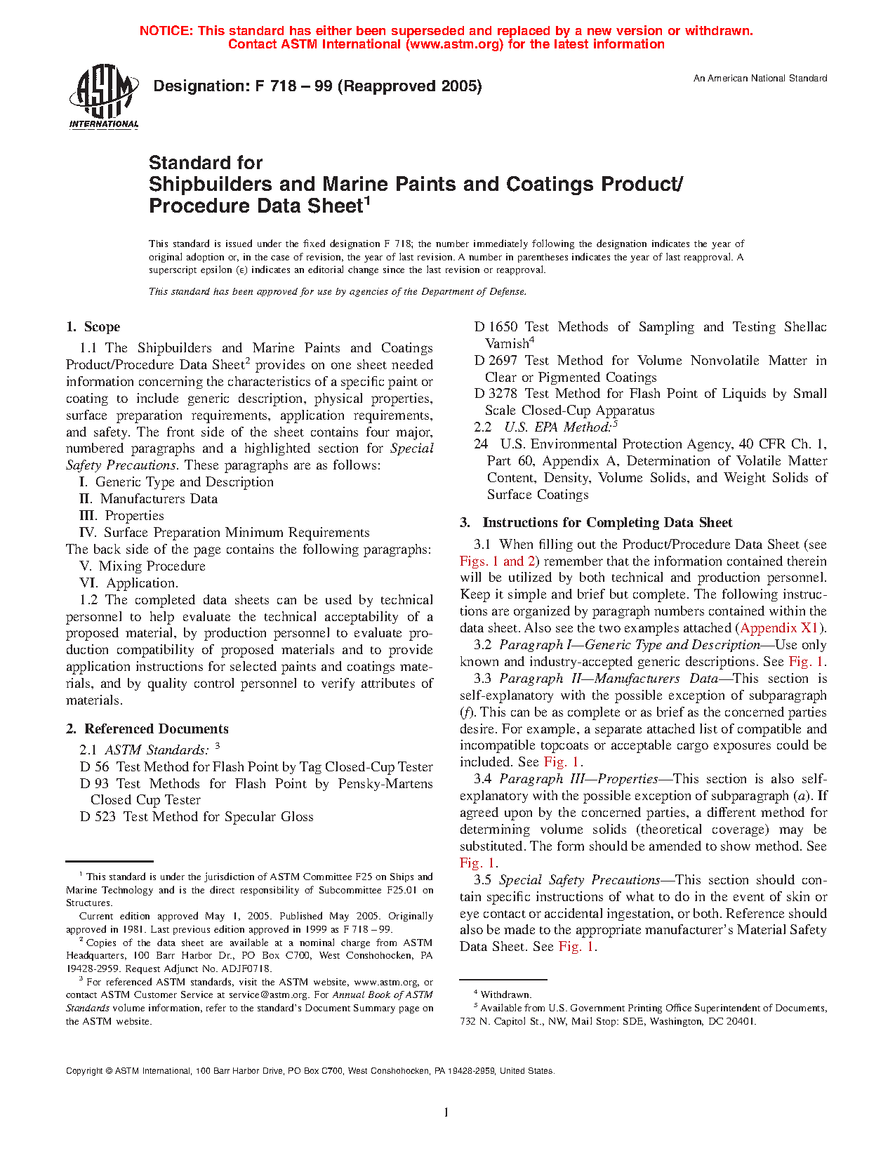1.1 The Shipbuilders and Marine Paints and Coatings Product/Procedure Data Sheet2 provides on one sheet needed information concerning the characteristics of a specific paint or coating to include generic description, physical properties, surface preparation requirements, application requirements, and safety. The front side of the sheet contains four major, numbered paragraphs and a highlighted section for Special Safety Precautions. These paragraphs are as follows: