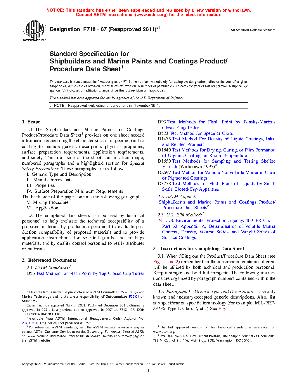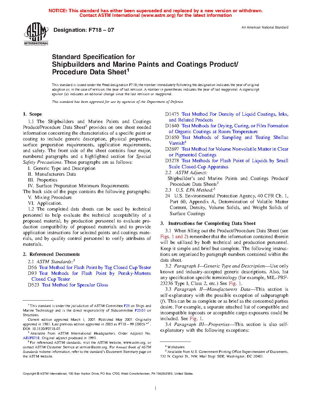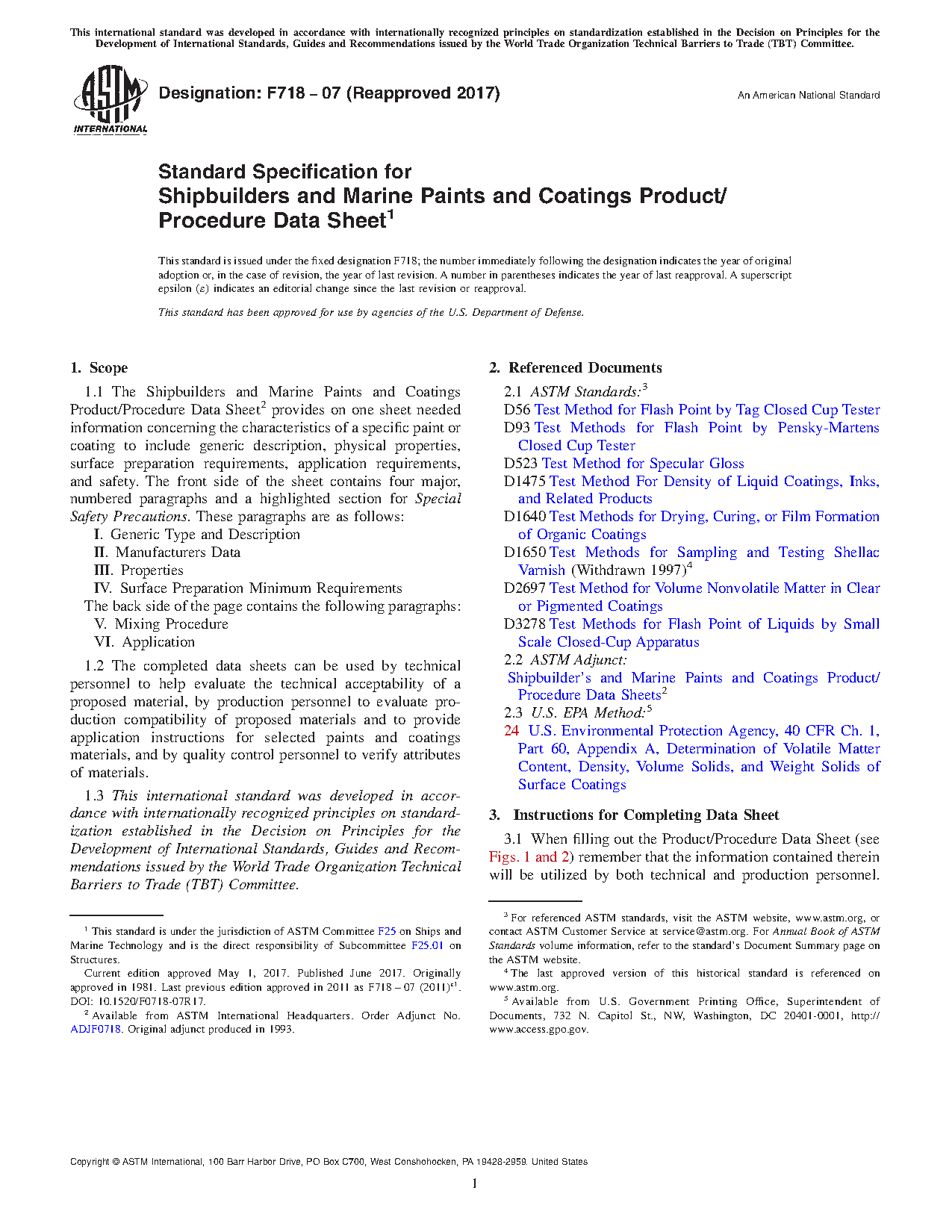 1.1 The Shipbuilders and Marine Paints and Coatings Product/Procedure Data Sheet2 provides on one sheet needed information concerning the characteristics of a specific paint or coating to include generic description, physical properties, surface preparation requirements, application requirements, and safety. The front side of the sheet contains four major, numbered paragraphs and a highlighted section for Special Safety Precautions. These paragraphs are as follows:
