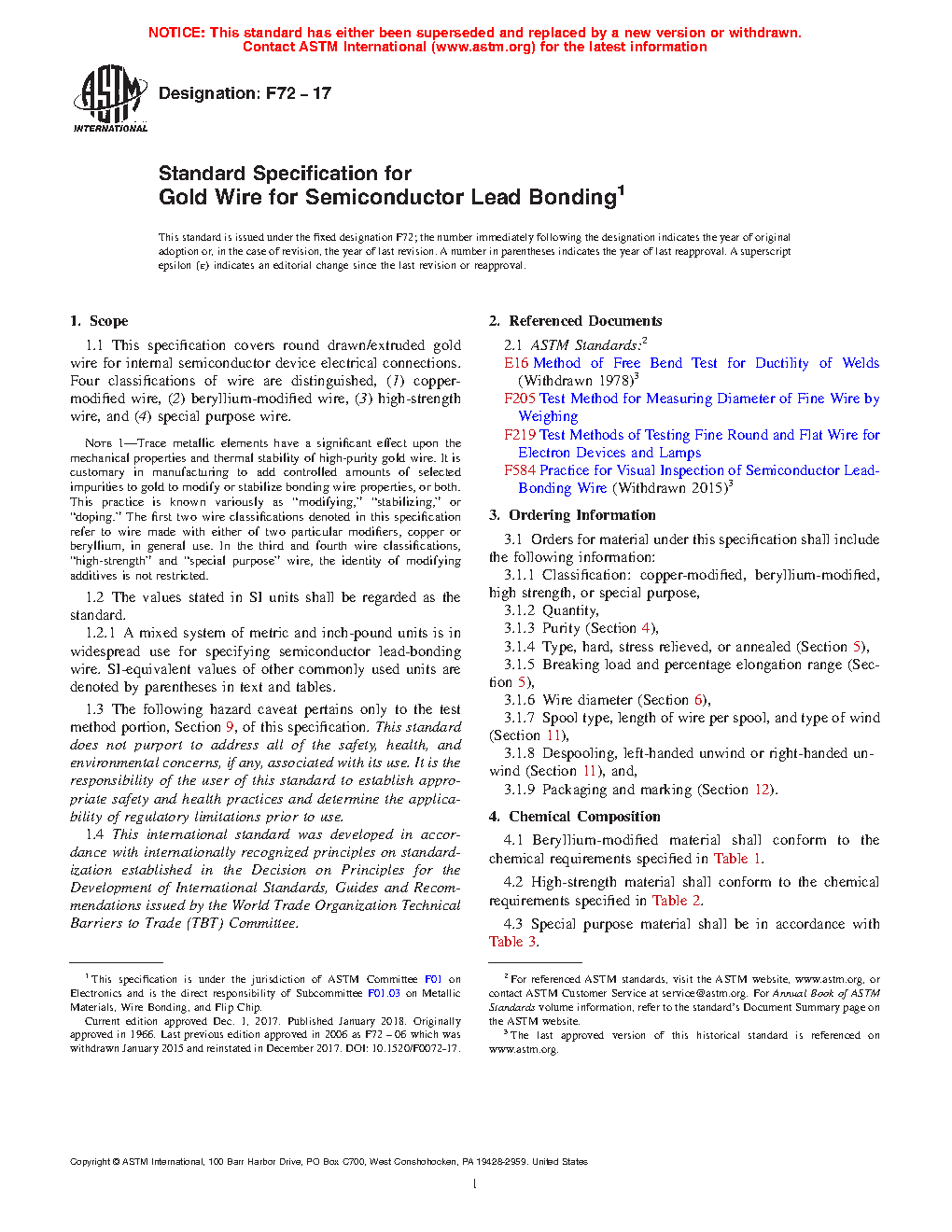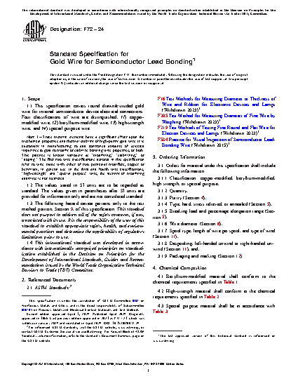 1.1 This specification covers round drawn/extruded gold wire for internal semiconductor device electrical connections. Four classifications of wire are distinguished, (1) copper-modified wire, (2) beryllium-modified wire, (3) high-strength wire, and (4) special purpose wire.