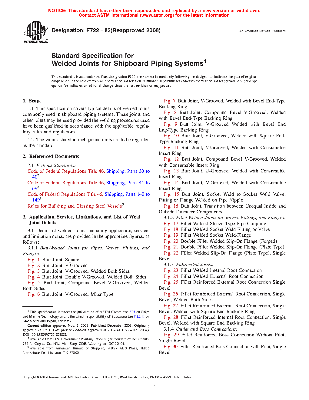 1.1 This specification covers typical details of welded joints commonly used in shipboard piping systems. These joints and other joints may be used provided the welding procedures used have been qualified in accordance with the applicable regulatory rules and regulations.