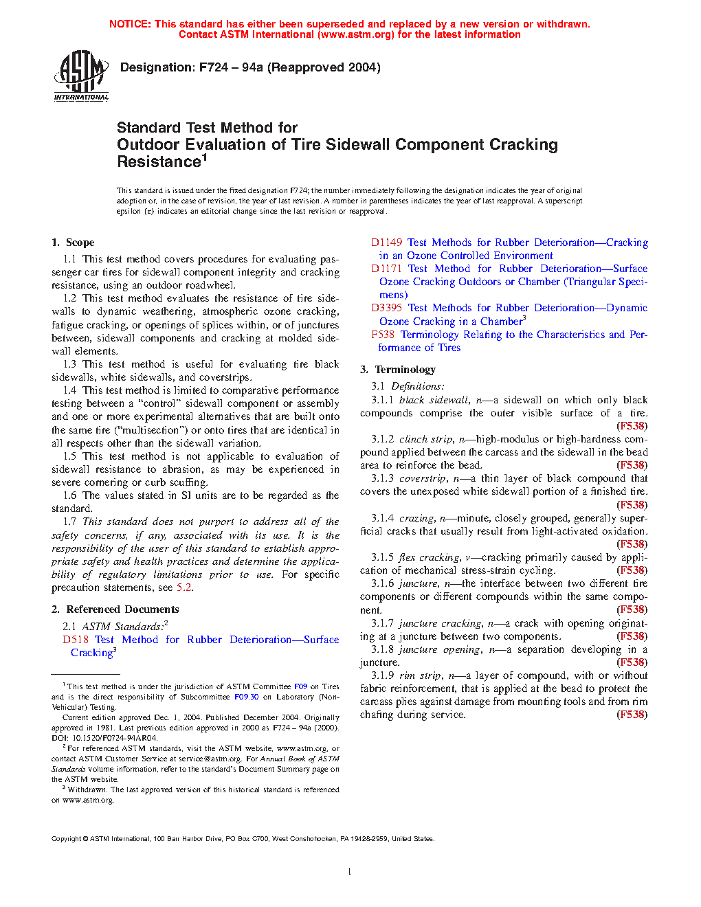 1.1 This test method covers procedures for evaluating passenger car tires for sidewall component integrity and cracking resistance, using an outdoor roadwheel.