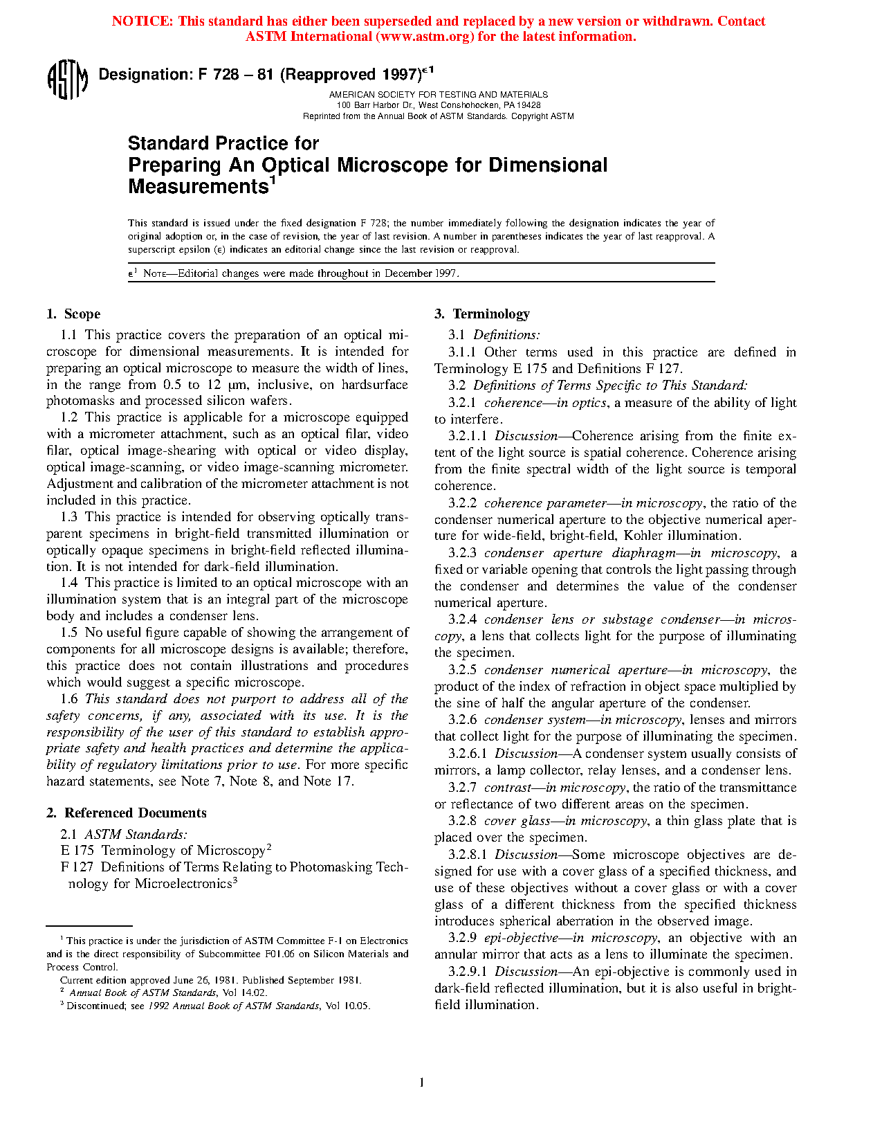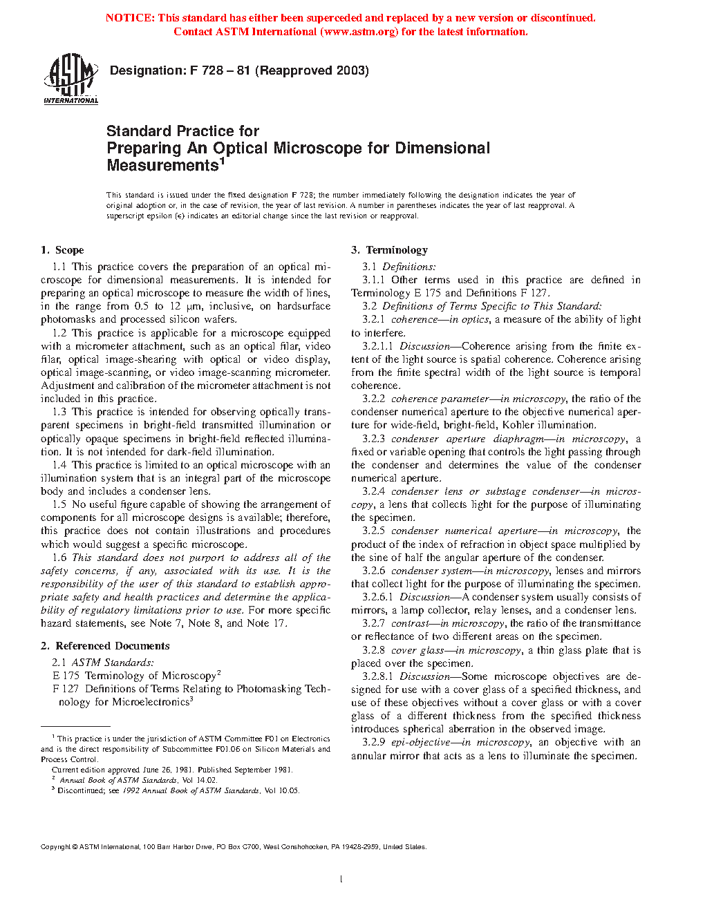 1.1 This practice covers the preparation of an optical microscope for dimensional measurements. It is intended for preparing an optical microscope to measure the width of lines, in the range from 0.5 to 12 [mu]m, inclusive, on hard-surface photomasks and processed silicon wafers.