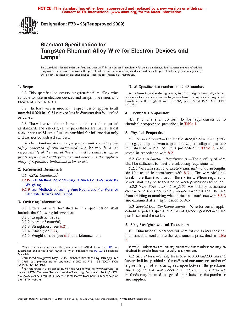 1.1 This specification covers tungsten-rhenium alloy wire suitable for use in electron devices and lamps. The material is known as UNS R07031.