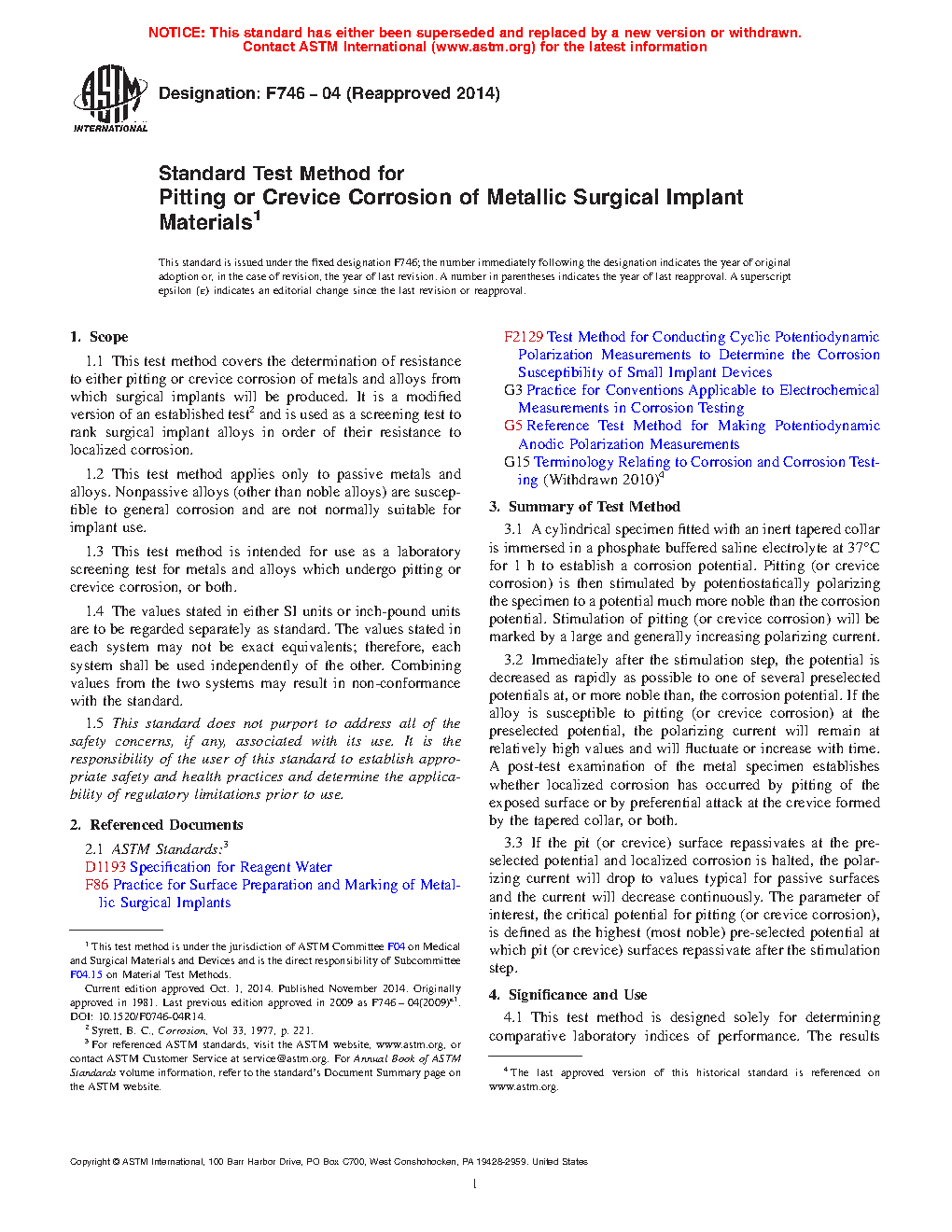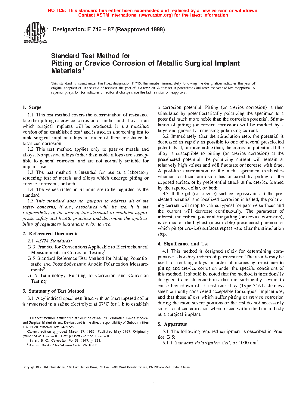 This test method is designed solely for determining comparative laboratory indices of performance. The results may be used for ranking alloys in order of increasing resistance to pitting and crevice corrosion under the specific conditions of this method. It should be noted that the method is intentionally designed to reach conditions that are sufficiently severe to cause breakdown of at least one alloy (Type 316 L stainless steel) currently considered acceptable for surgical implant use, and that those alloys which suffer pitting or crevice corrosion during the more severe portions of the test do not necessarily suffer localized corrosion when placed within the human body as a surgical implant.