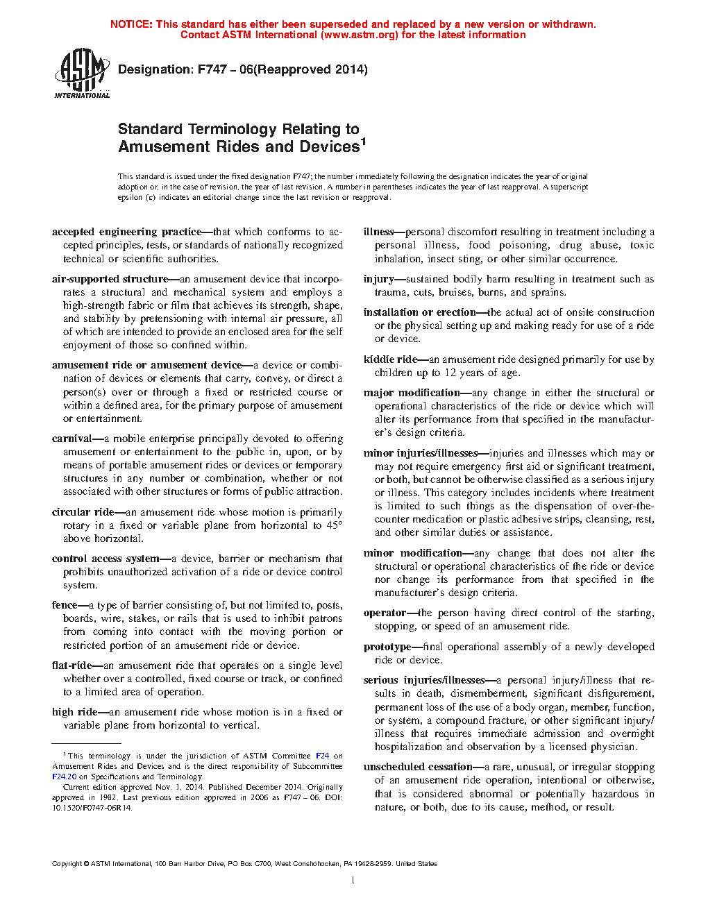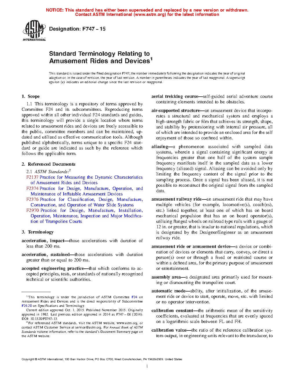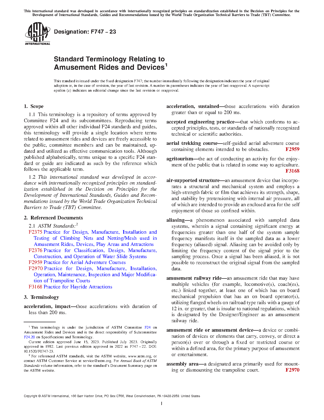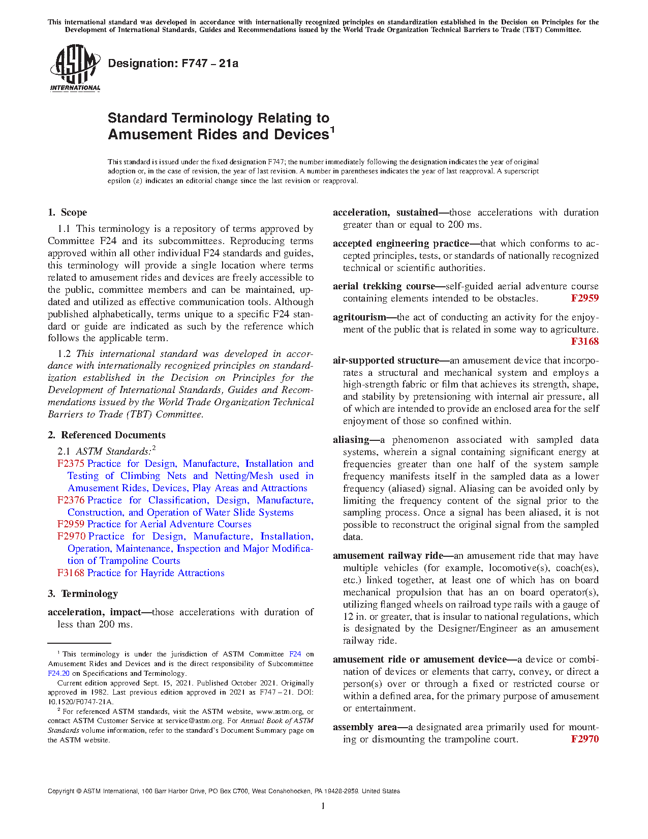 1.1 This terminology is a repository of terms approved by Committee F24 and its subcommittees. Reproducing terms approved within all other individual F24 standards and guides, this terminology will provide a single location where terms related to amusement rides and devices are freely accessible to the public, committee members and can be maintained, updated and utilized as effective communication tools. Although published alphabetically, terms unique to a specific F24 standard or guide are indicated as such by the reference which follows the applicable term.