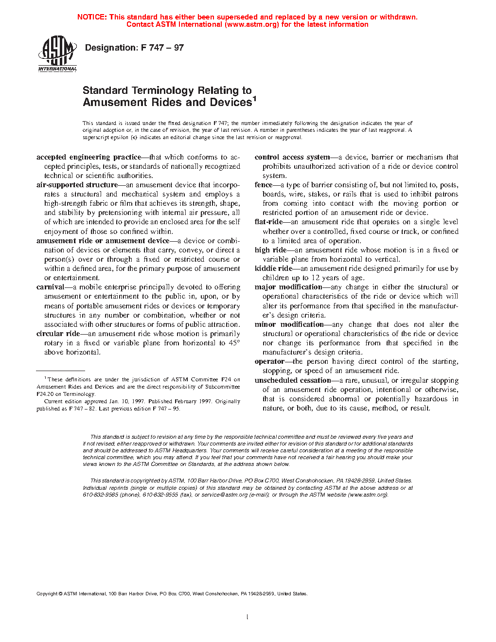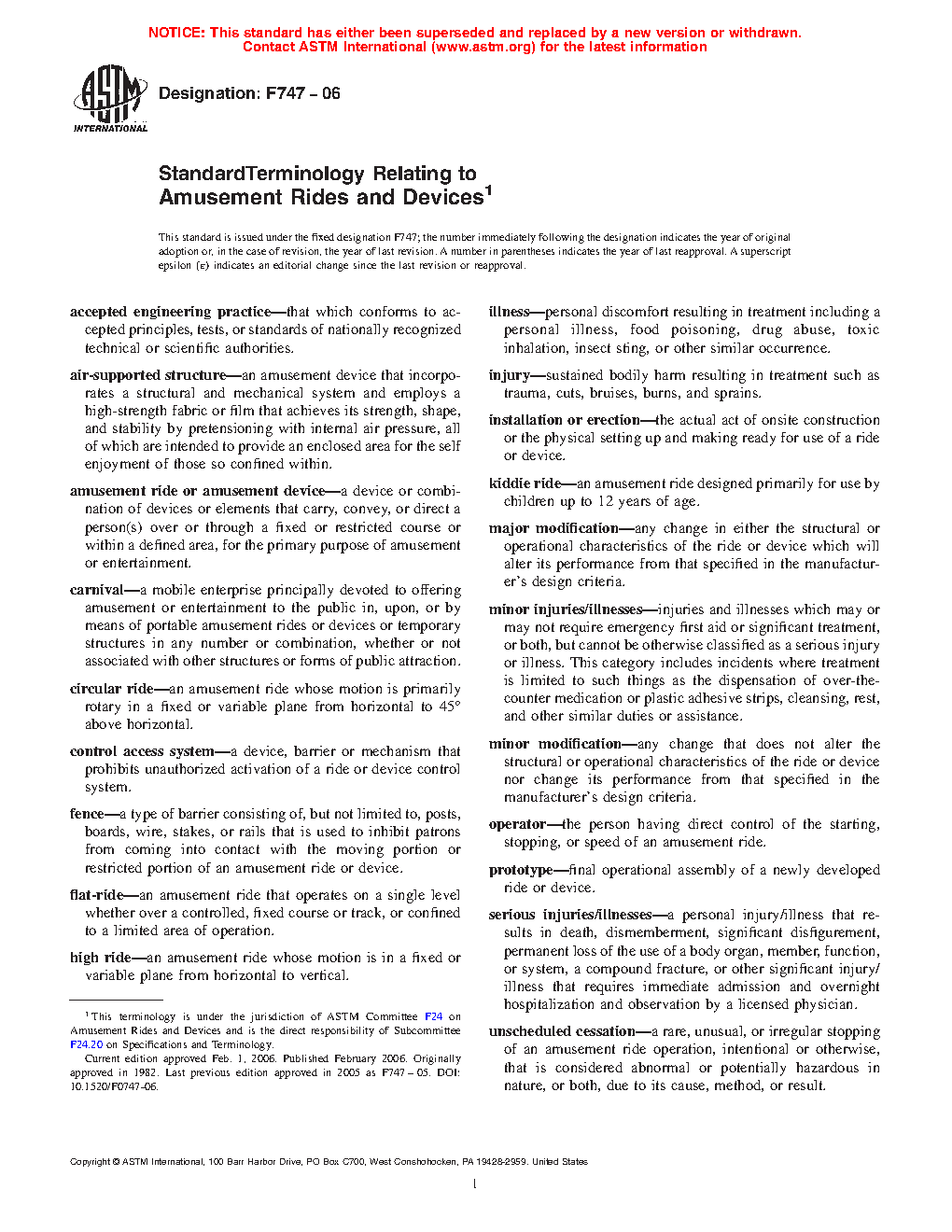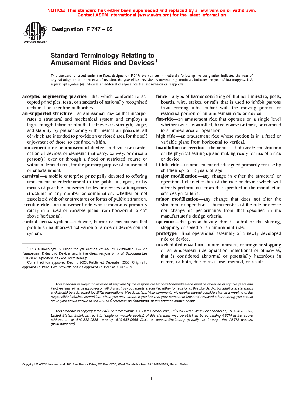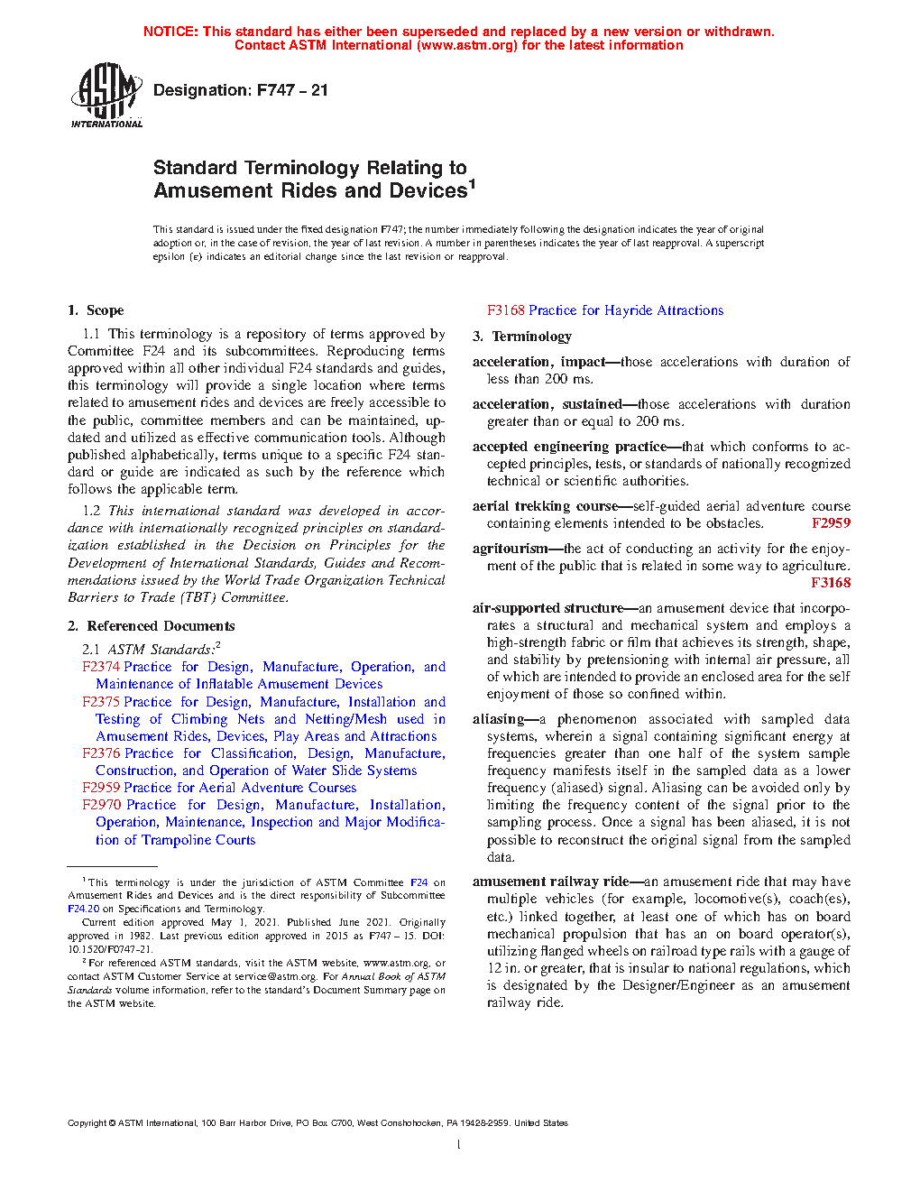 1.1 This terminology is a repository of terms approved by Committee F24 and its subcommittees. Reproducing terms approved within all other individual F24 standards and guides, this terminology will provide a single location where terms related to amusement rides and devices are freely accessible to the public, committee members and can be maintained, updated and utilized as effective communication tools. Although published alphabetically, terms unique to a specific F24 standard or guide are indicated as such by the reference which follows the applicable term.