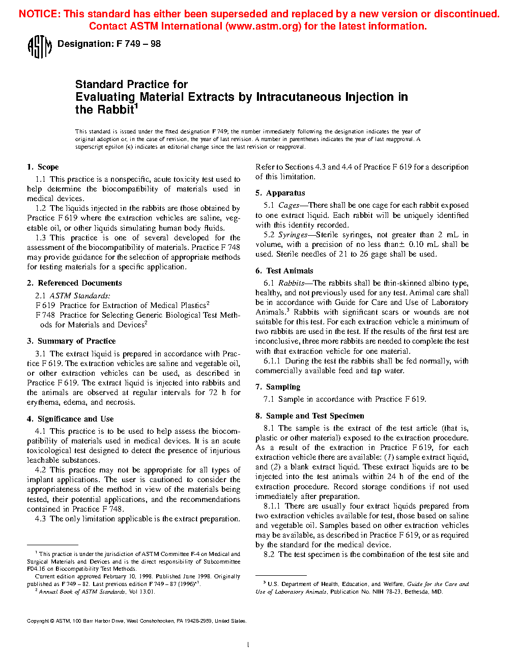 This practice is to be used to help assess the biocompatibility of materials used in medical devices. It is an acute toxicological test designed to detect the presence of injurious leachable substances.