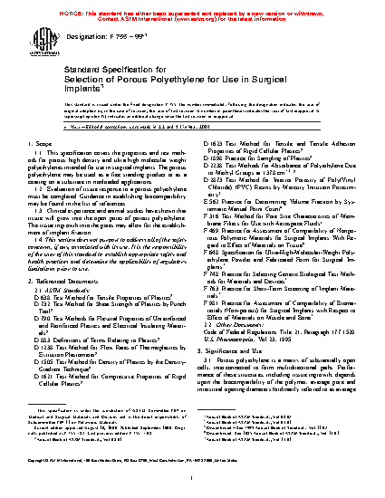 1.1 This specification covers the properties and test methods for porous high density and ultra high molecular weight polyethylenes intended for use in surgical implants. The porous polyethylene may be used as a free standing product or as a coating on a substrate in nonloaded applications..