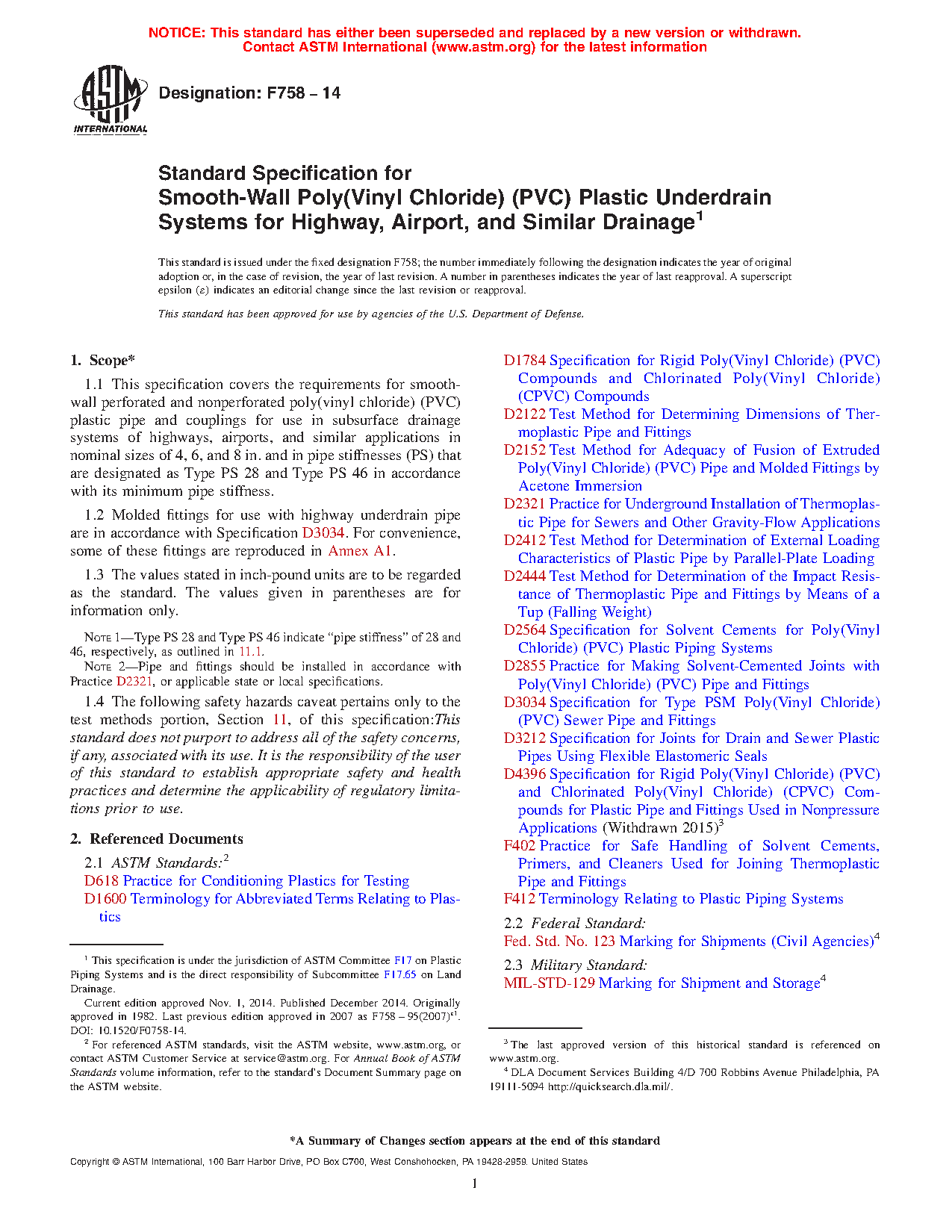 1.1 This specification covers the requirements for smooth-wall perforated and nonperforated poly(vinyl chloride) (PVC) plastic pipe and couplings for use in subsurface drainage systems of highways, airports, and similar applications in nominal sizes of 4, 6, and 8 in. and in pipe stiffnesses (PS) that are designated as Type PS 28 and Type PS 46 in accordance with its minimum pipe stiffness.