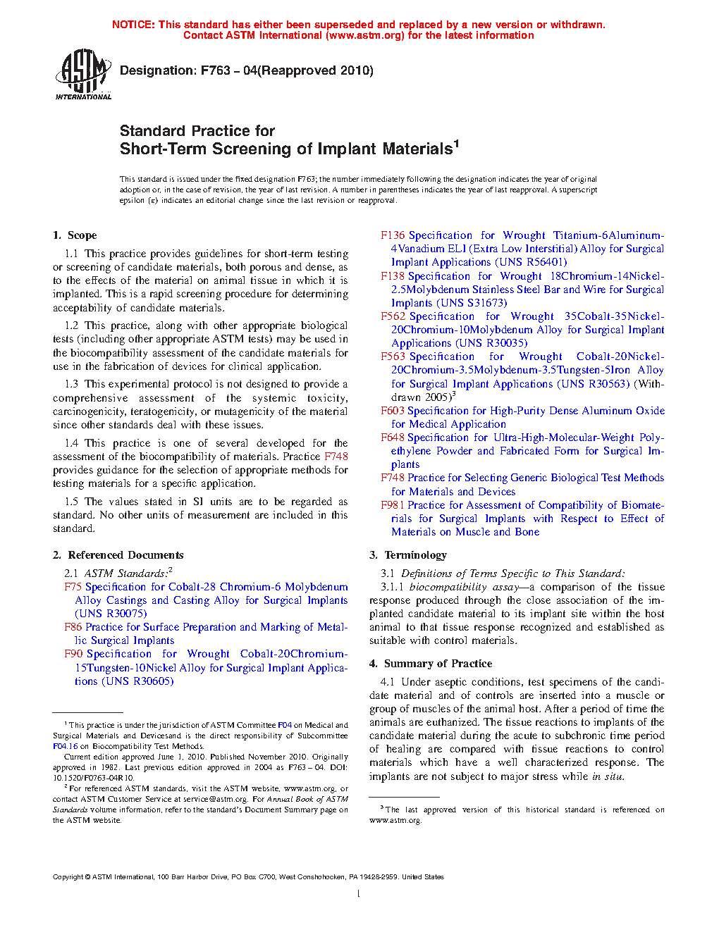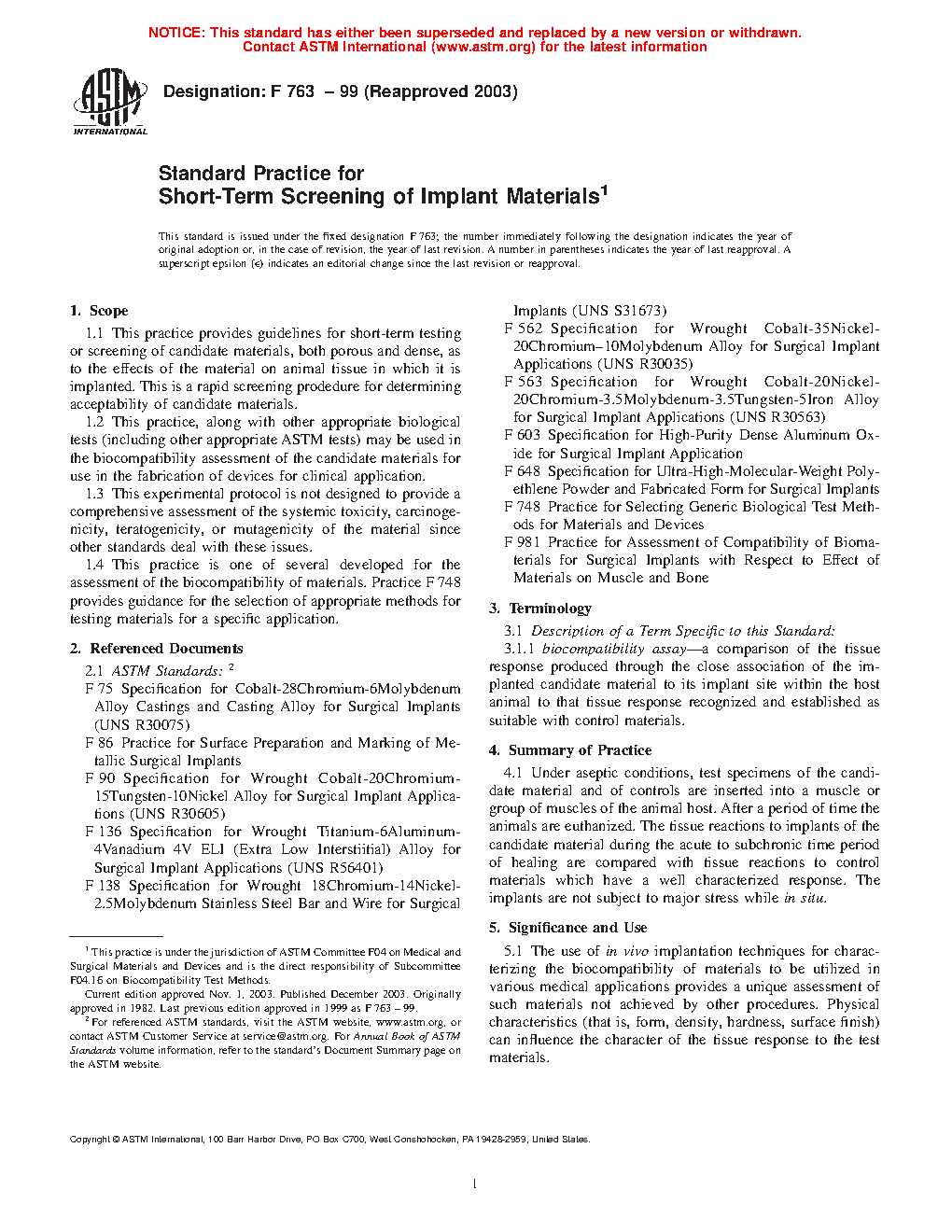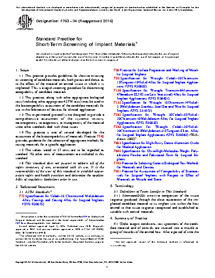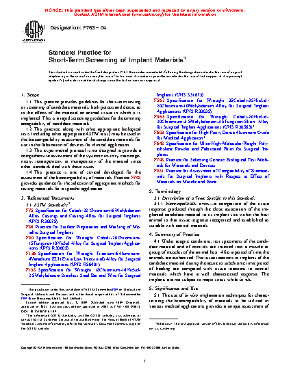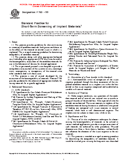 4.2 This practice is intended as a short-term screening procedure for determining the acceptability of candidate materials. It may be utilized prior to using the long-term tests described in Practice F981. It is recommended that for some applications, additional tests, including long-term implantation studies, may be required to assess the final suitability of the candidate materials.