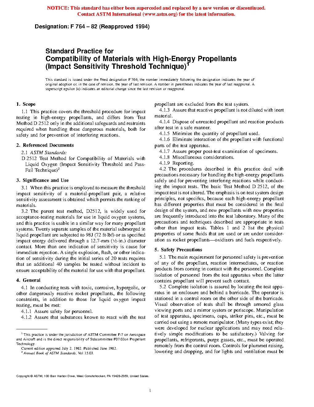 Standard Practice for Compatibility of Materials with High-Energy Propellants (Impact Sensitivity Threshold Technique) (Withdrawn 2003)