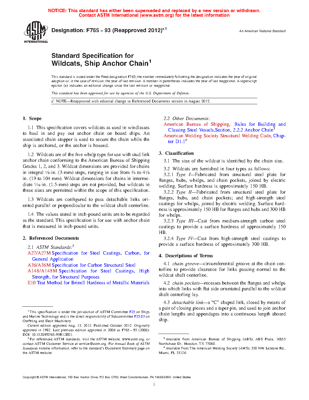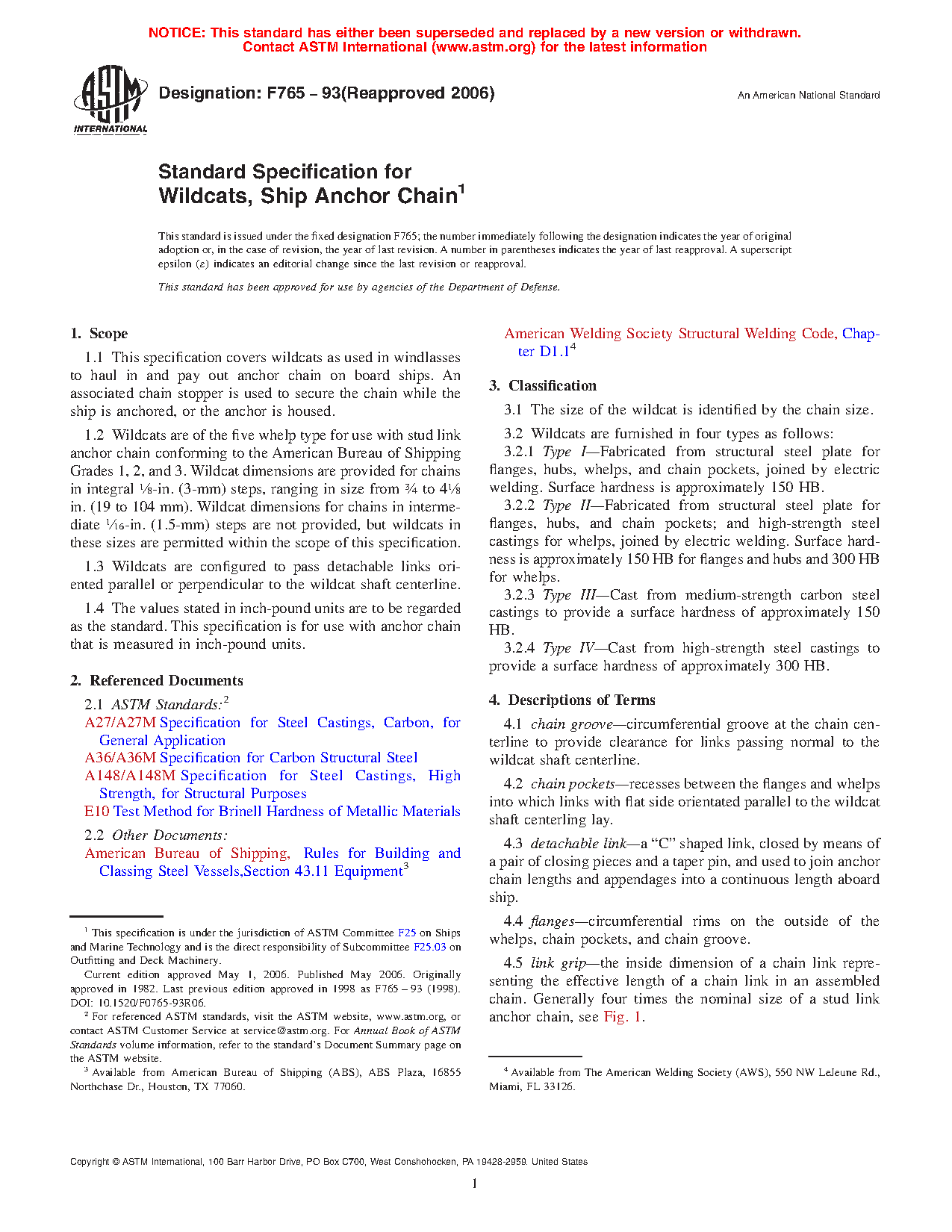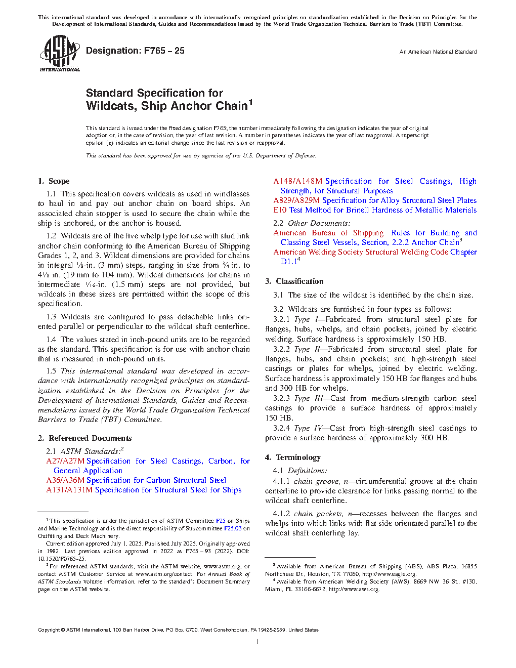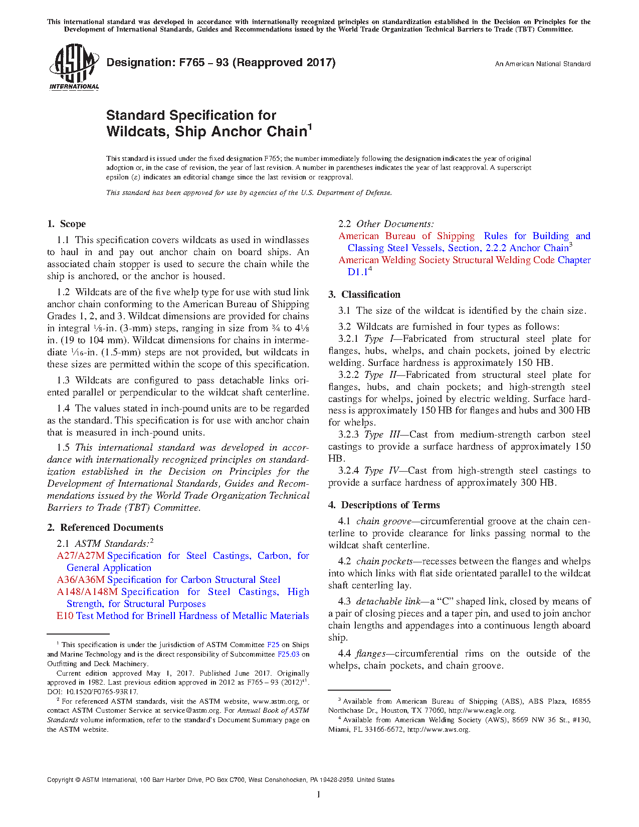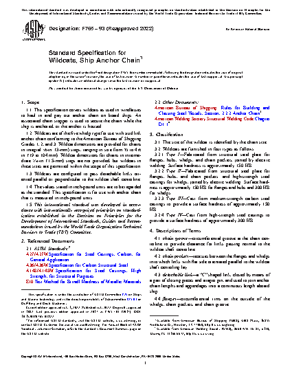 1.1 This specification covers wildcats as used in windlasses to haul in and pay out anchor chain on board ships. An associated chain stopper is used to secure the chain while the ship is anchored, or the anchor is housed.