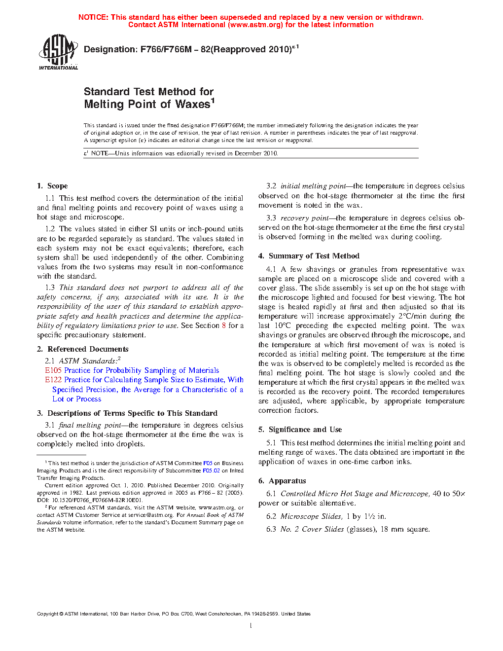 This test method determines the initial melting point and melting range of waxes. The data obtained are important in the application of waxes in one-time carbon inks.