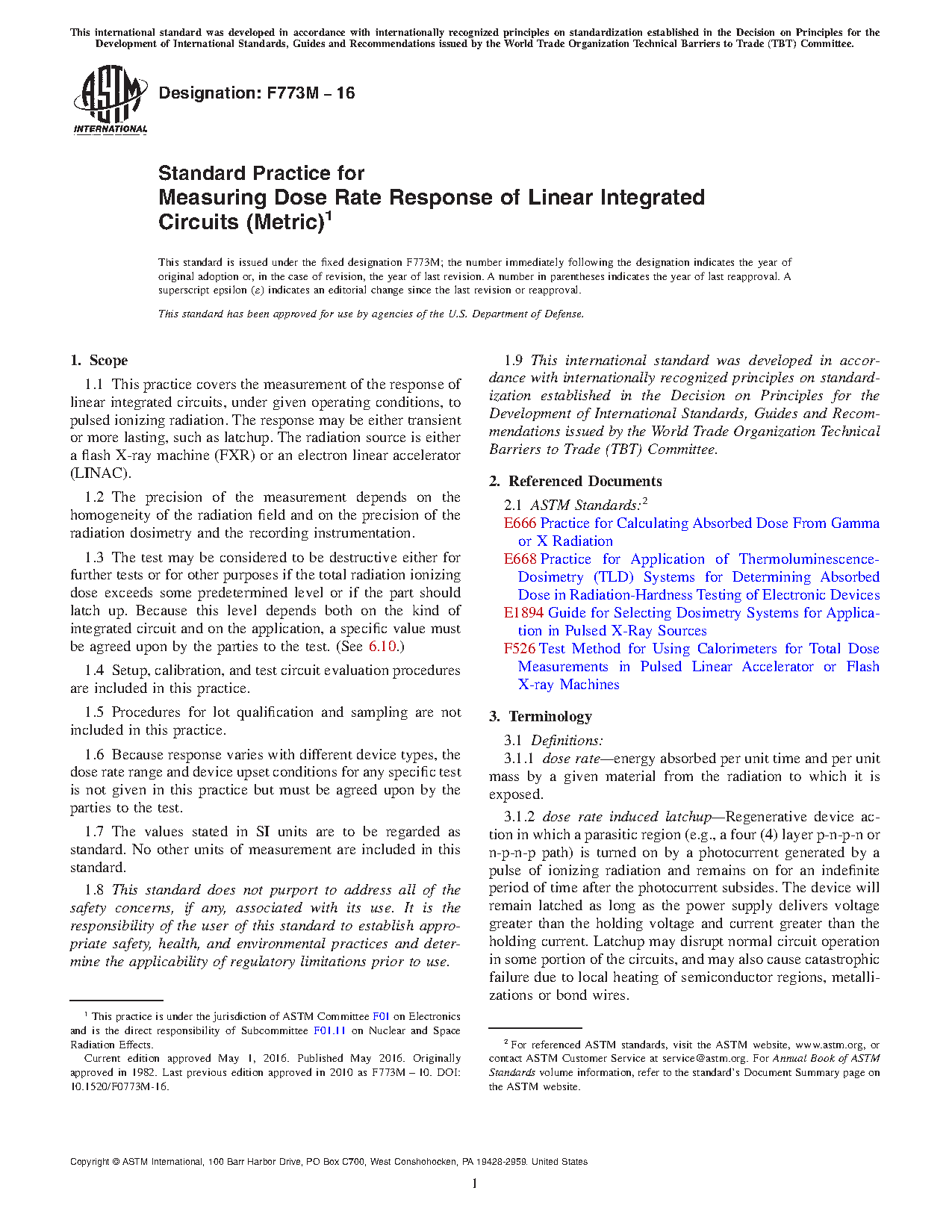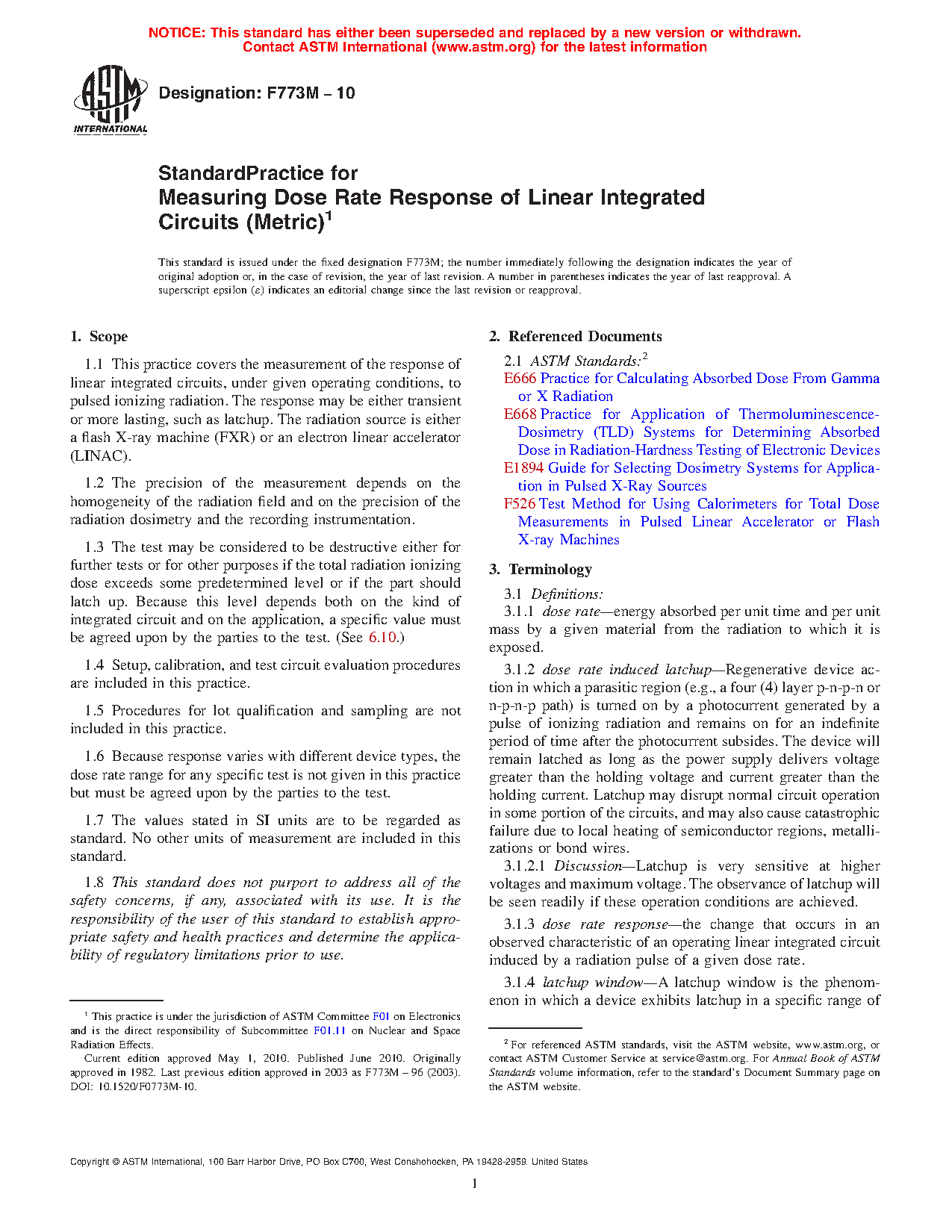 1.3 The test may be considered to be destructive either for further tests or for other purposes if the total radiation ionizing dose exceeds some predetermined level or if the part should latch up. Because this level depends both on the kind of integrated circuit and on the application, a specific value must be agreed upon by the parties to the test. (See 6.10.)