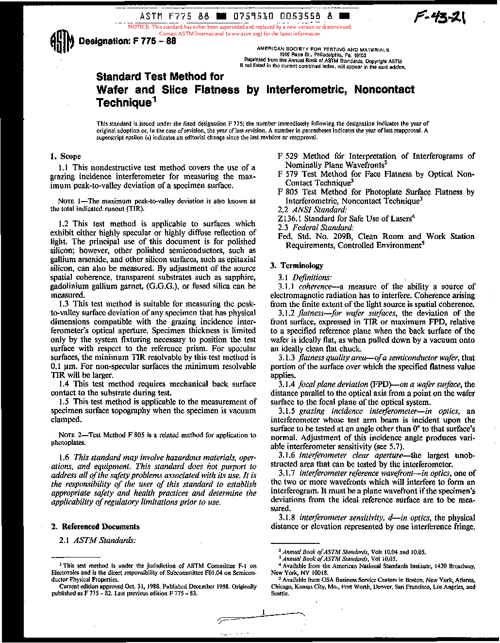 Test Method for Wafer and Slice Flatness by Interferometric (Withdrawn 1991)