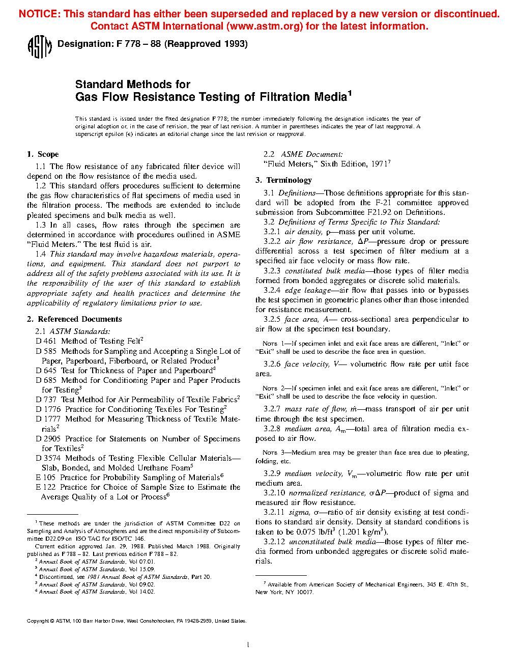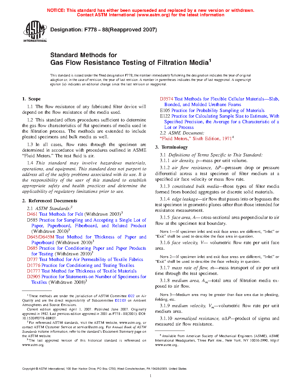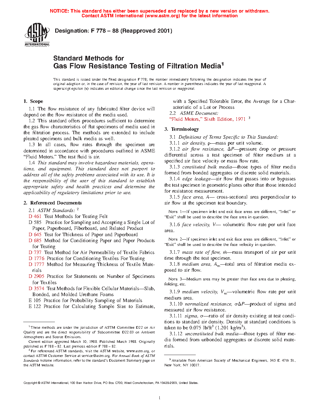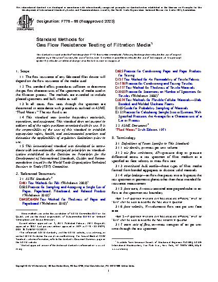 1.2 This standard offers procedures sufficient to determine the gas flow characteristics of flat specimens of media used in the filtration process. The methods are extended to include pleated specimens and bulk media as well.
