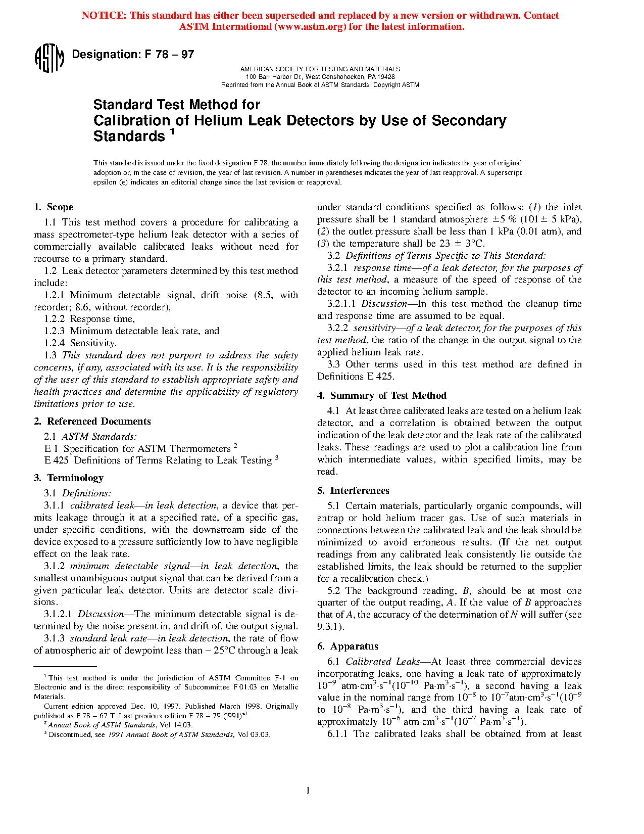 Standard Test Method for Calibration of Helium Leak Detectors by Use of Secondary Standards (Withdrawn 2008)