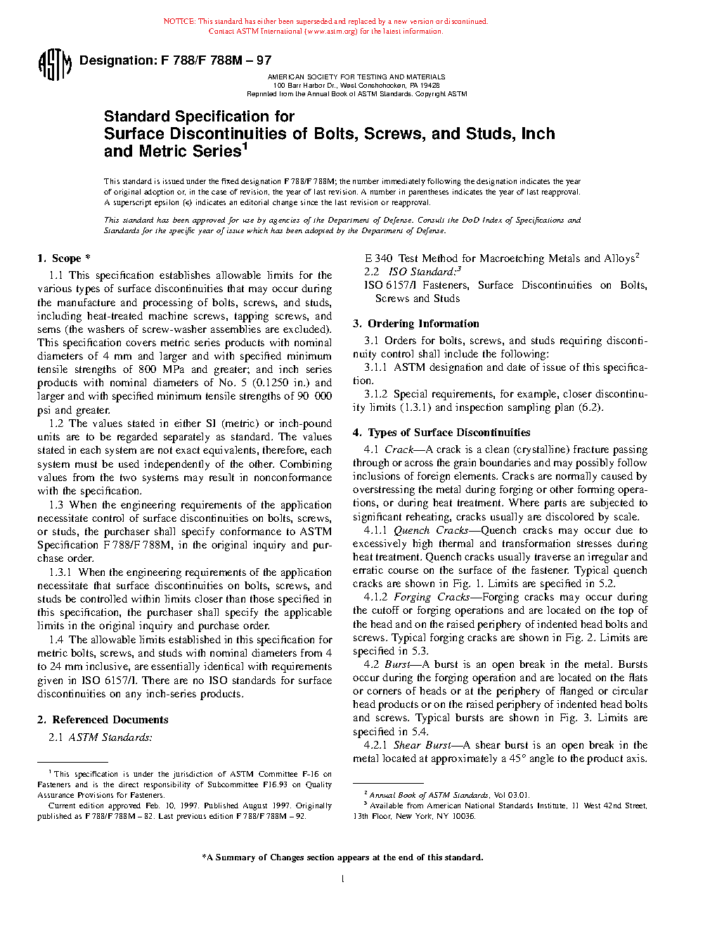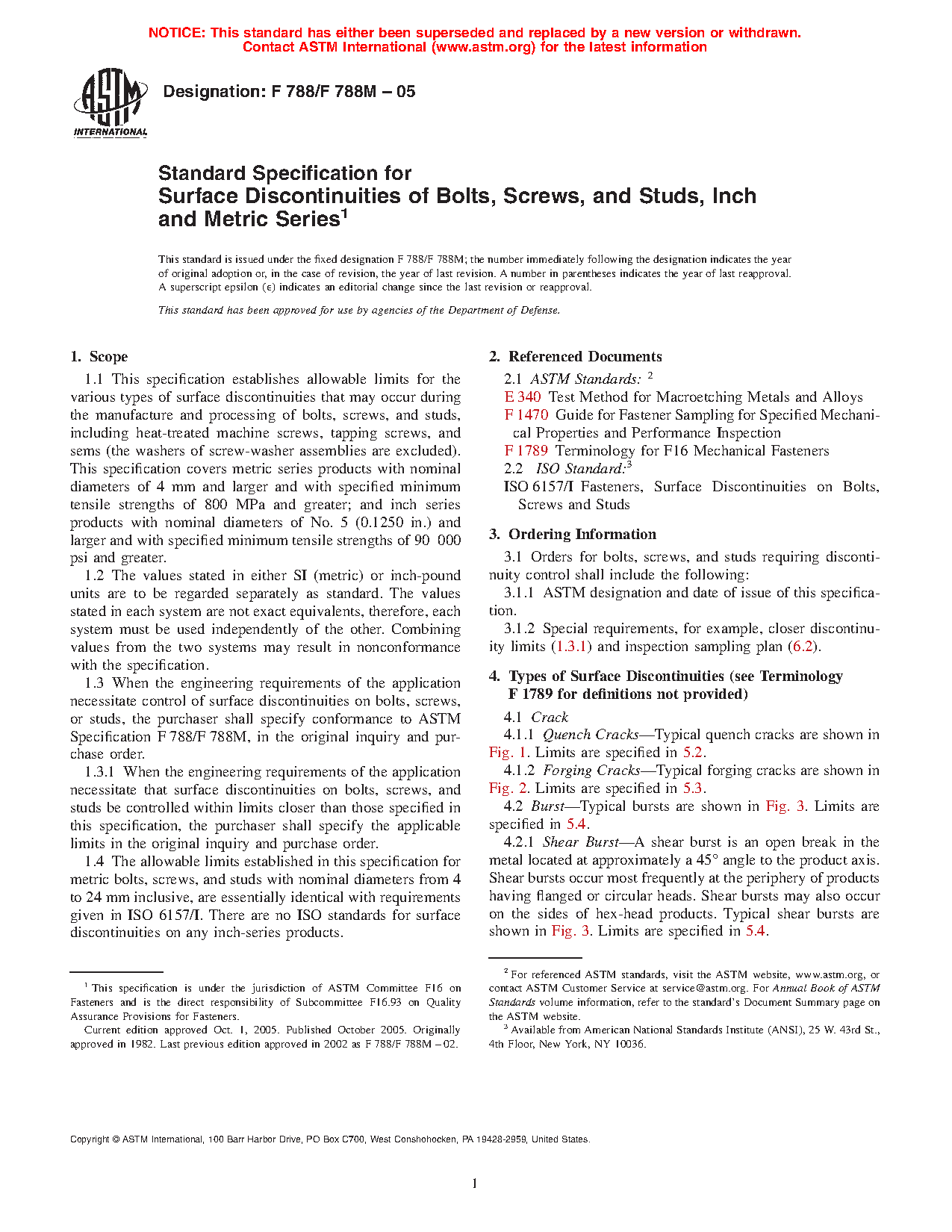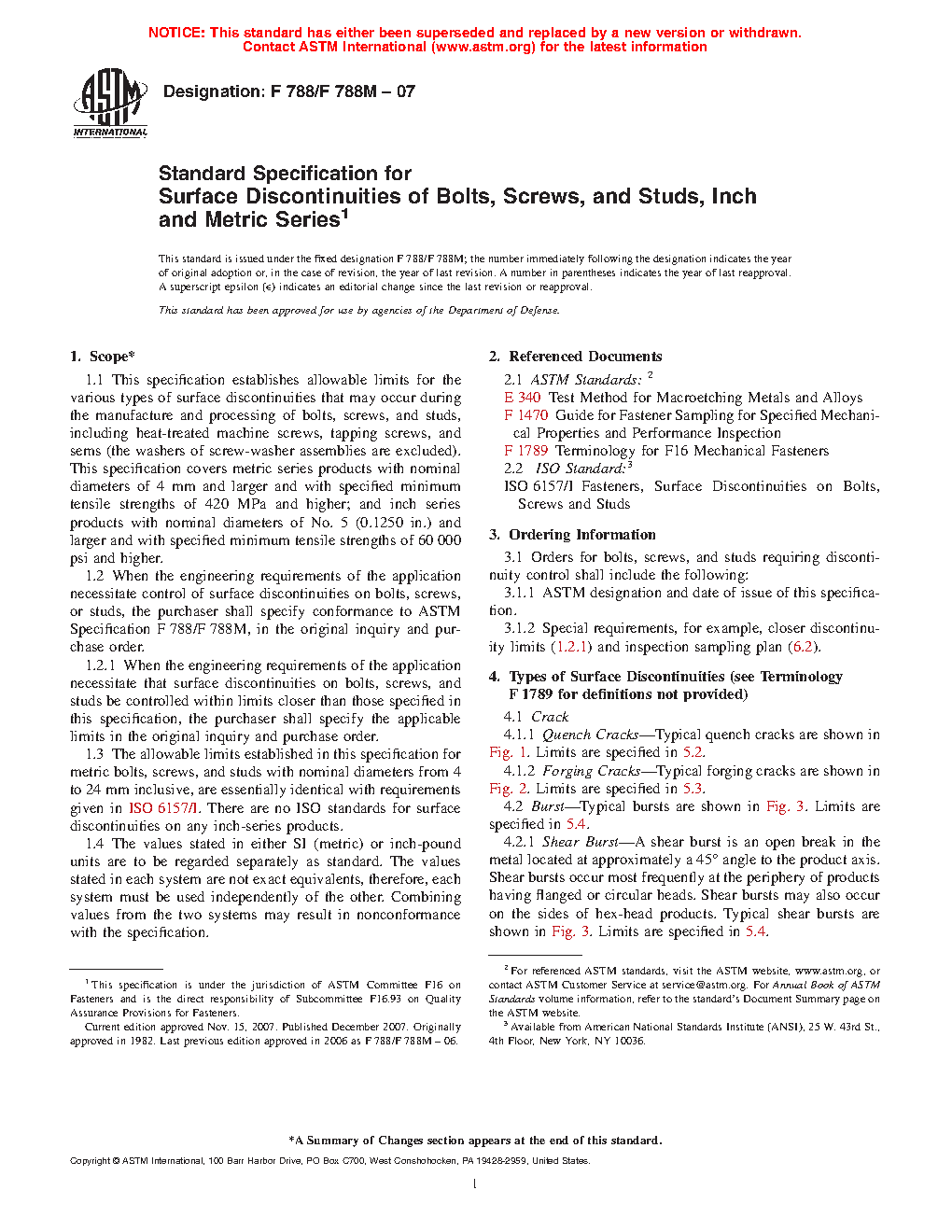 1.3 When the engineering requirements of the application necessitate control of surface discontinuities on bolts, screws, or studs, the purchaser shall specify conformance to ASTM Specification F 788/F 788M, in the original inquiry and purchase order.