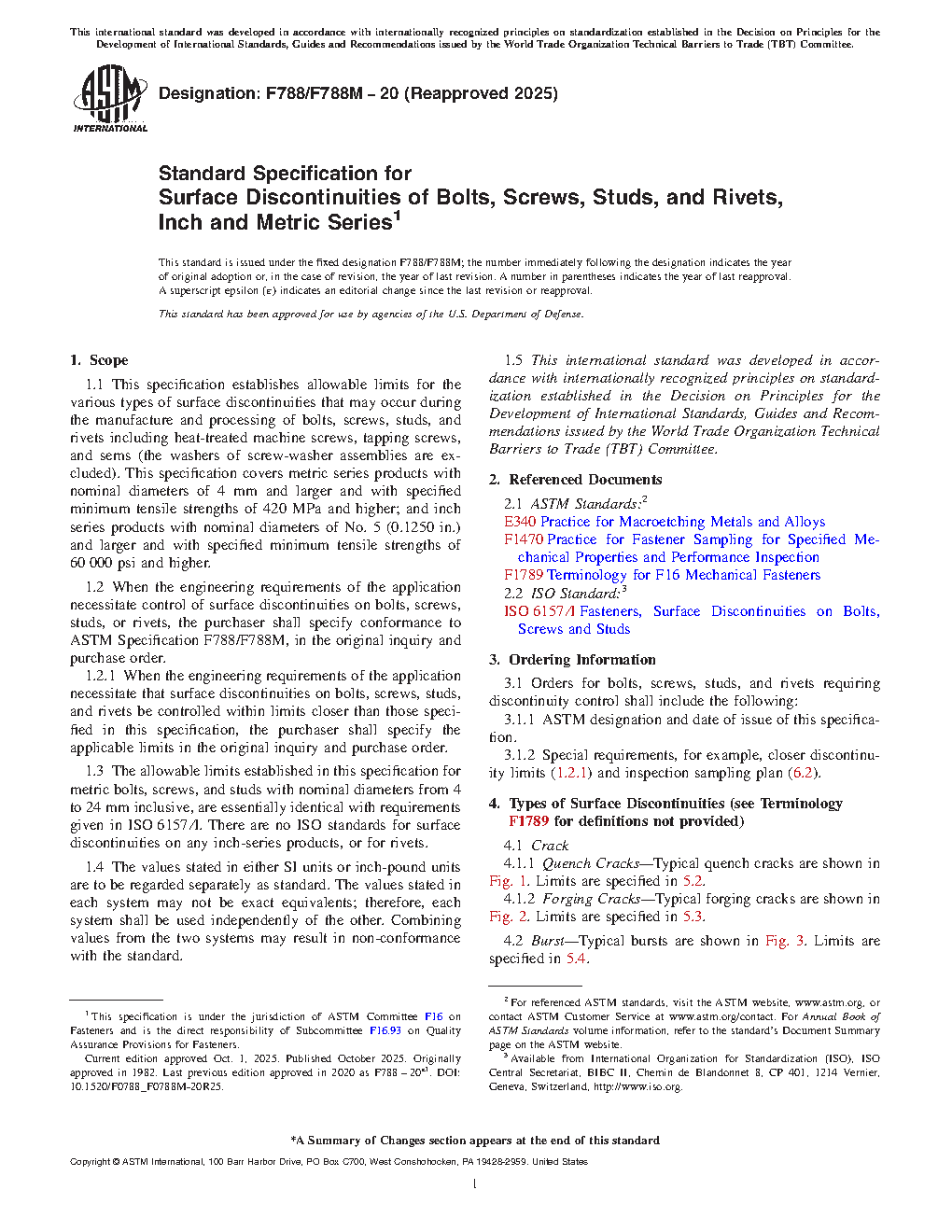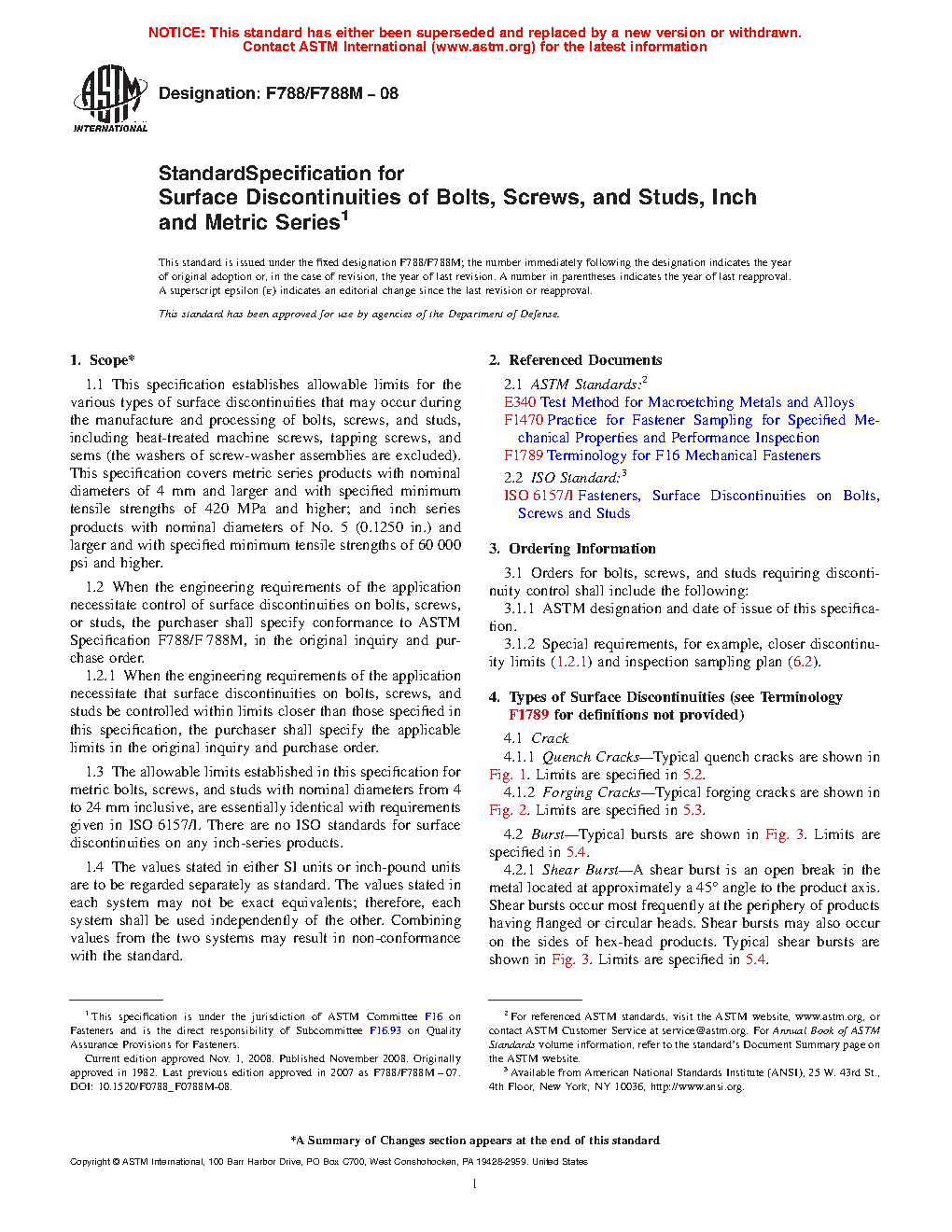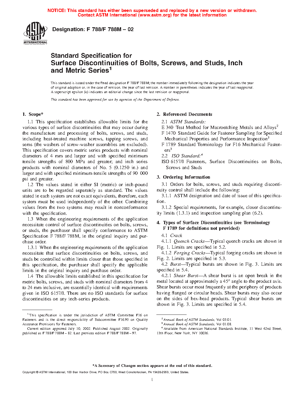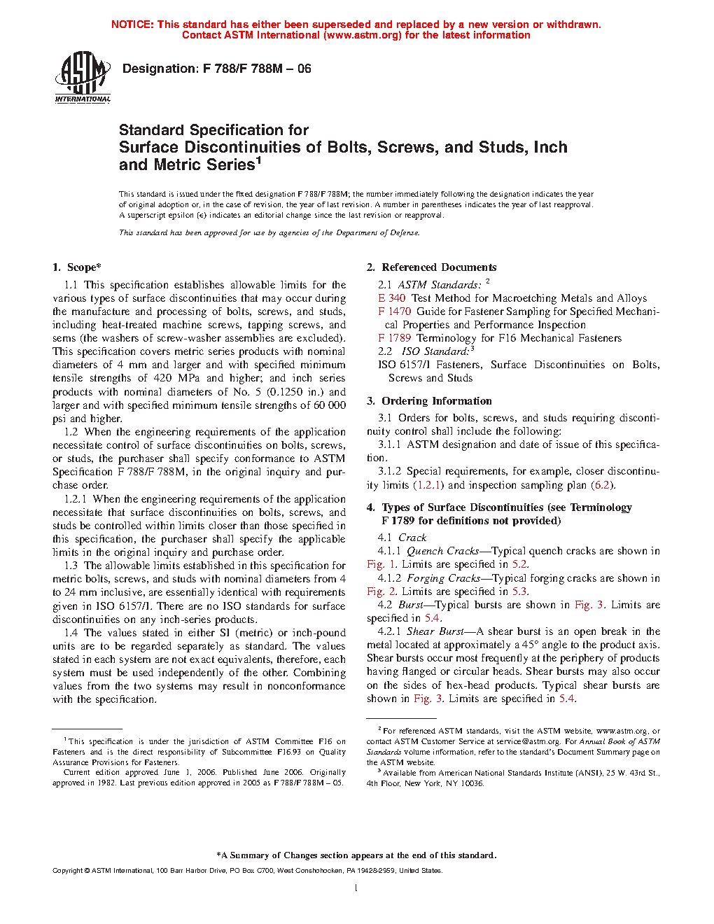1.3 When the engineering requirements of the application necessitate control of surface discontinuities on bolts, screws, or studs, the purchaser shall specify conformance to ASTM Specification F 788/F 788M, in the original inquiry and purchase order.