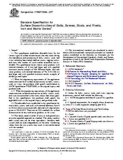 1.1 This specification establishes allowable limits for the various types of surface discontinuities that may occur during the manufacture and processing of bolts, screws, and studs, including heat-treated machine screws, tapping screws, and sems (the washers of screw-washer assemblies are excluded). This specification covers metric series products with nominal diameters of 4 mm and larger and with specified minimum tensile strengths of 800 MPa and greater; and inch series products with nominal diameters of No. 5 (0.1250 in.) and larger and with specified minimum tensile strengths of 90000 psi and greater.