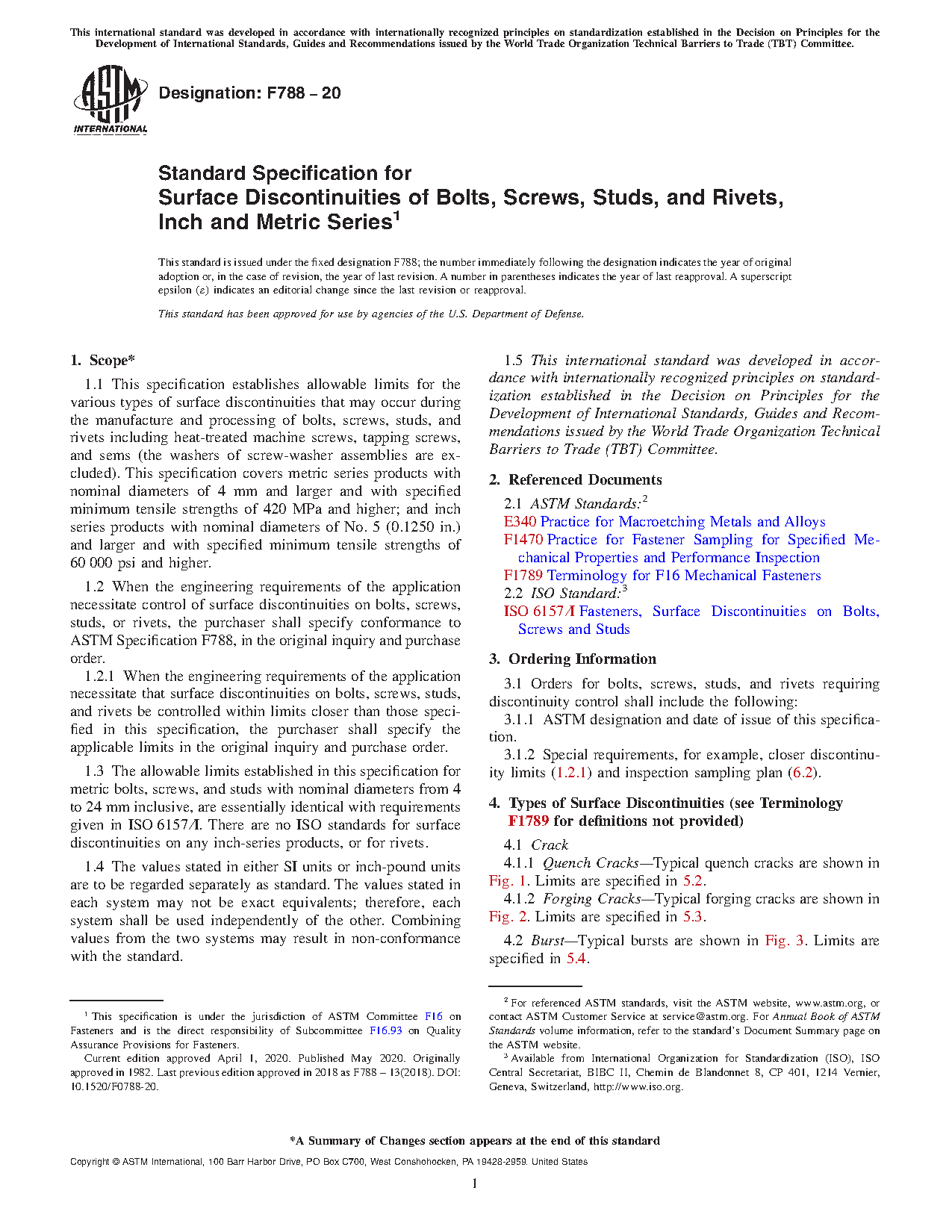 1.2 When the engineering requirements of the application necessitate control of surface discontinuities on bolts, screws, studs, or rivets, the purchaser shall specify conformance to ASTM Specification F788/F788M, in the original inquiry and purchase order.