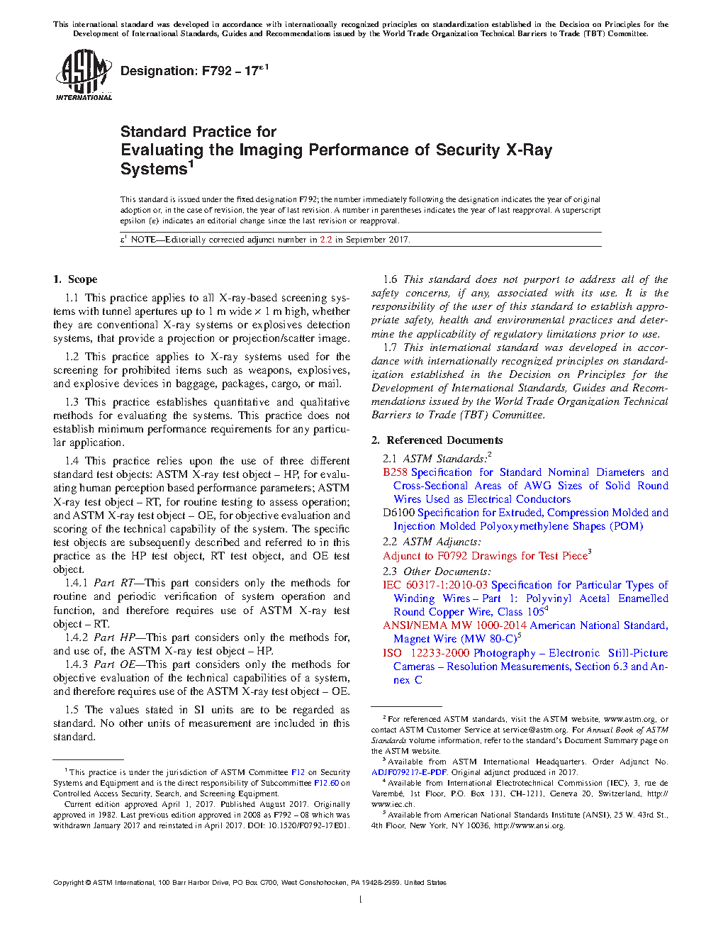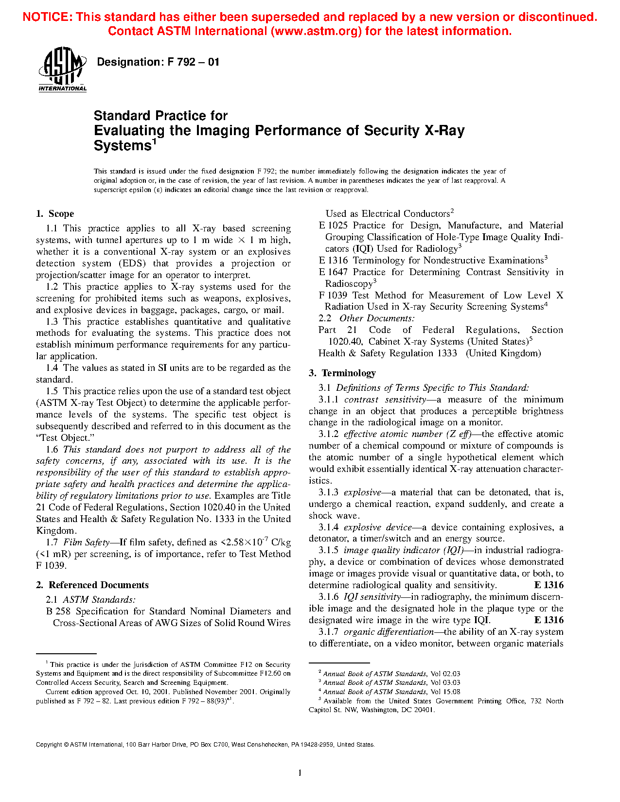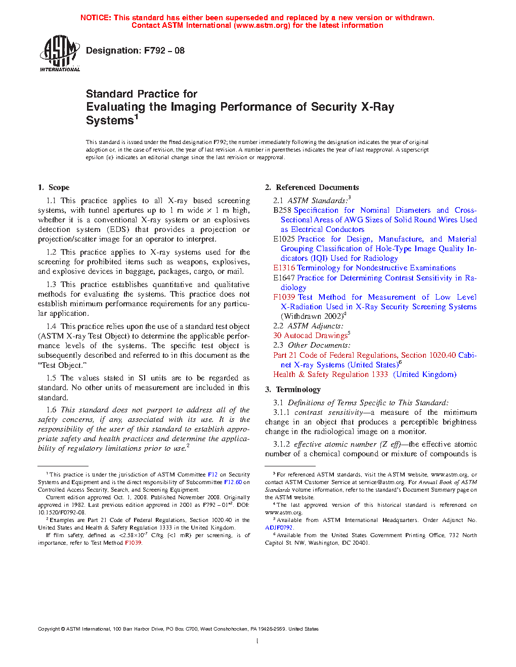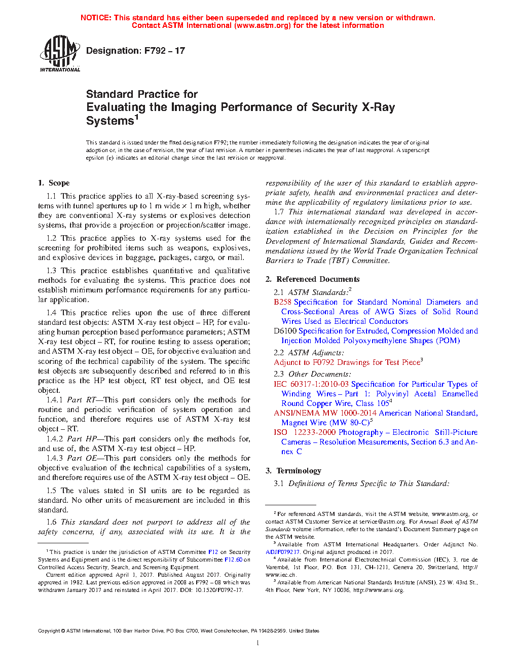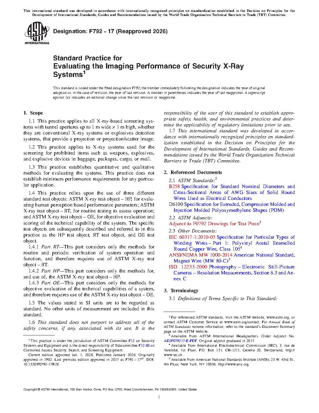 1.1 This practice applies to all X-ray based screening systems, with tunnel apertures up to 1 m wide × 1 m high, whether it is a conventional X-ray system or an explosives detection system (EDS) that provides a projection or projection/scatter image for an operator to interpret.