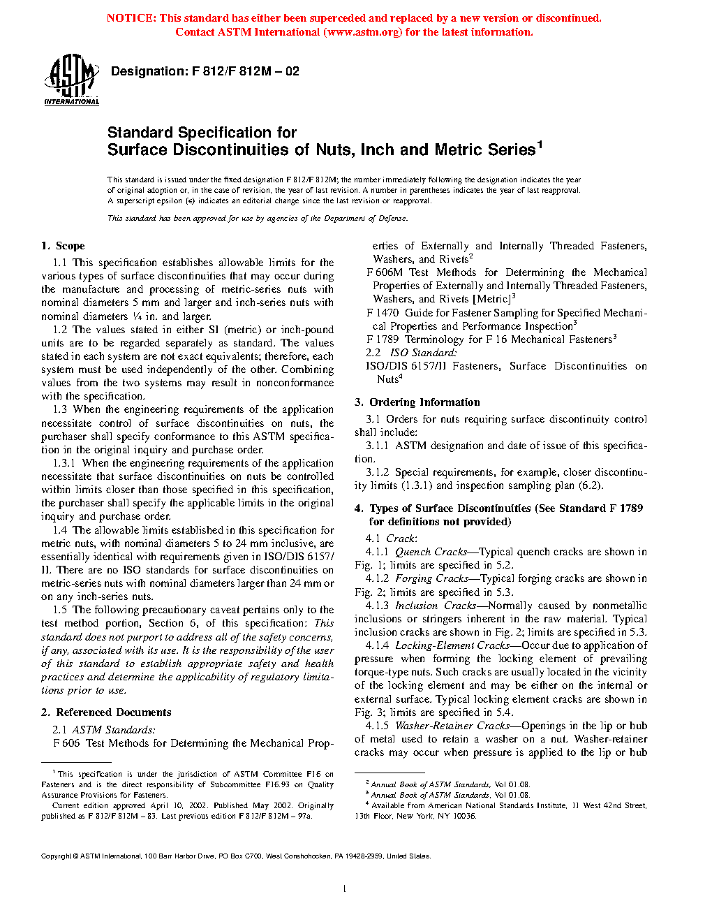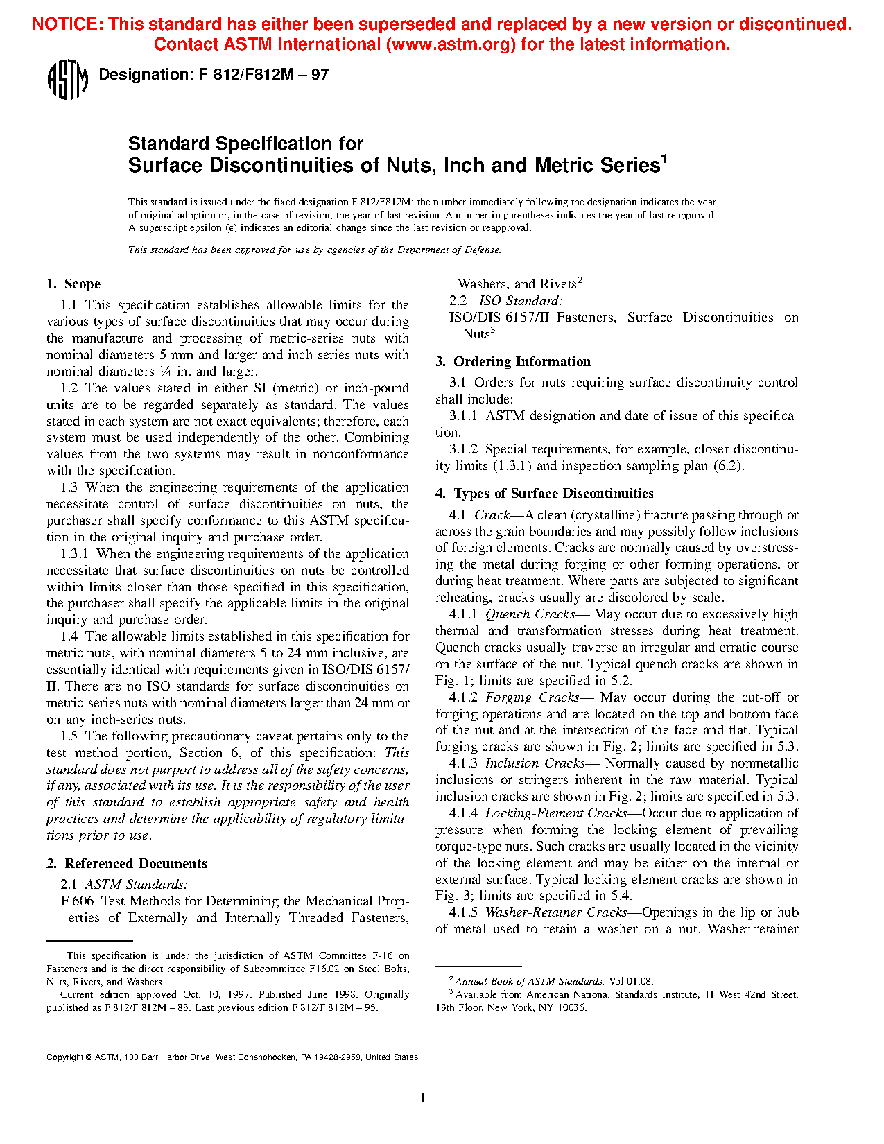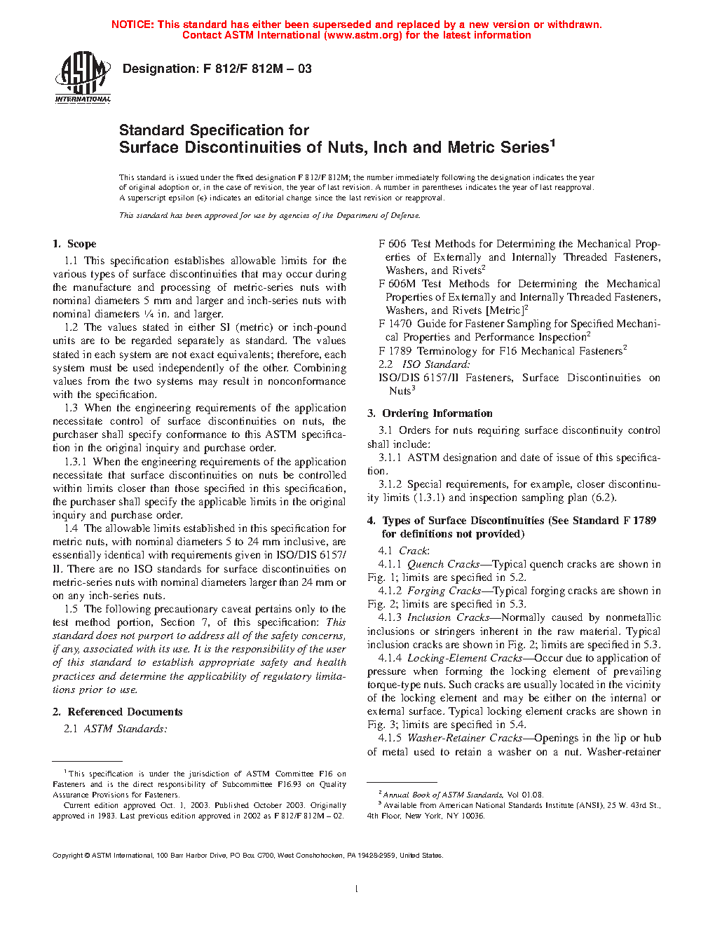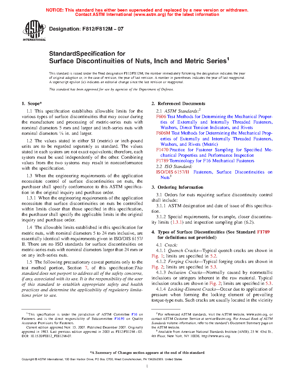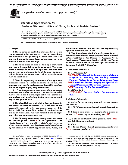 1.1 This specification establishes allowable limits for the various types of surface discontinuities that may occur during the manufacture and processing of metric-series nuts with nominal diameters 5 mm and larger and inch-series nuts with nominal diameters 1/4 in. and larger.