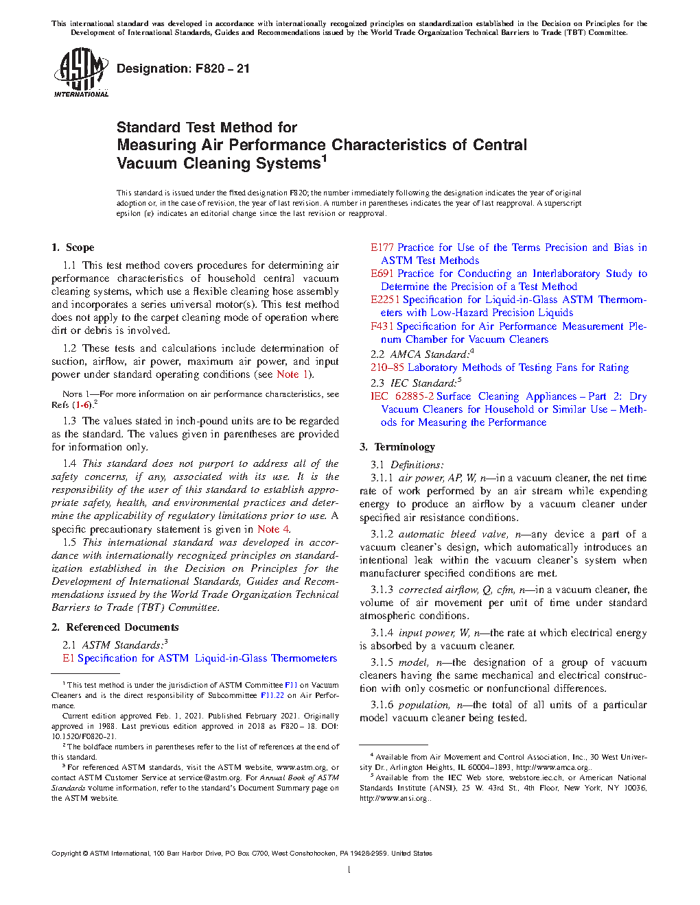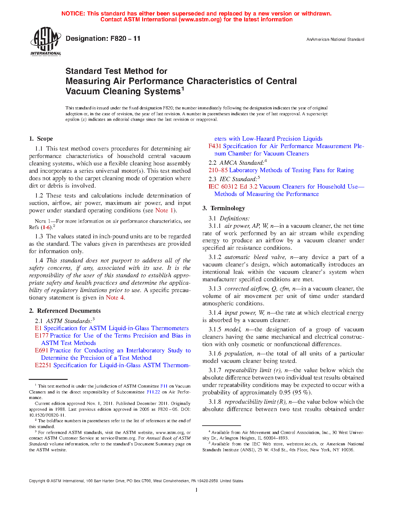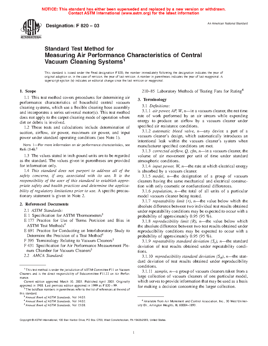 1.2 These tests and calculations include determination of suction, airflow, air power, maximum air power, and input power under standard operating conditions (see Note 1).