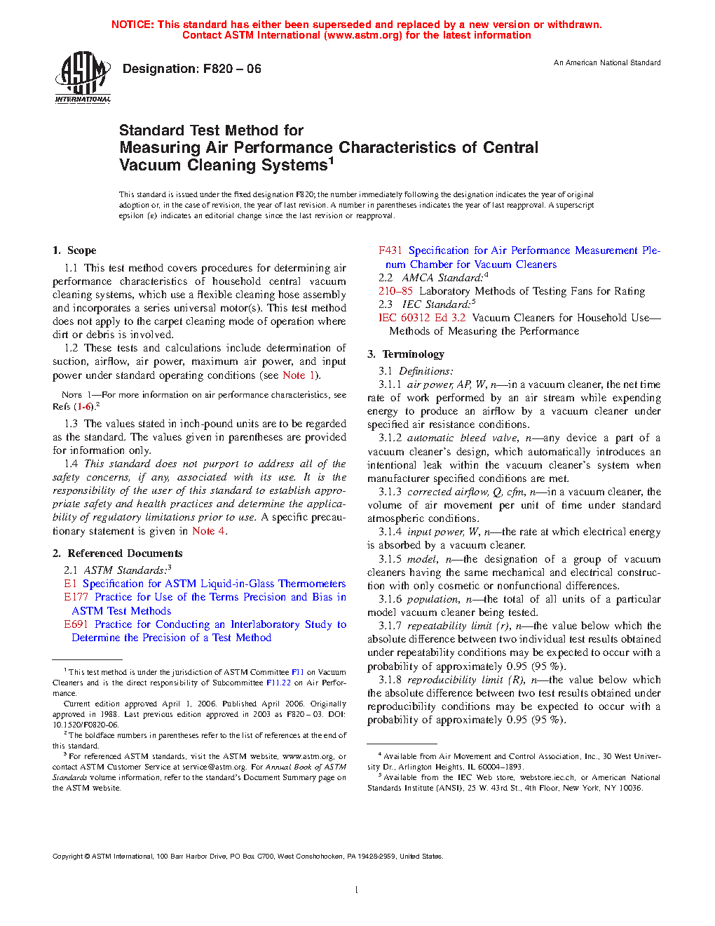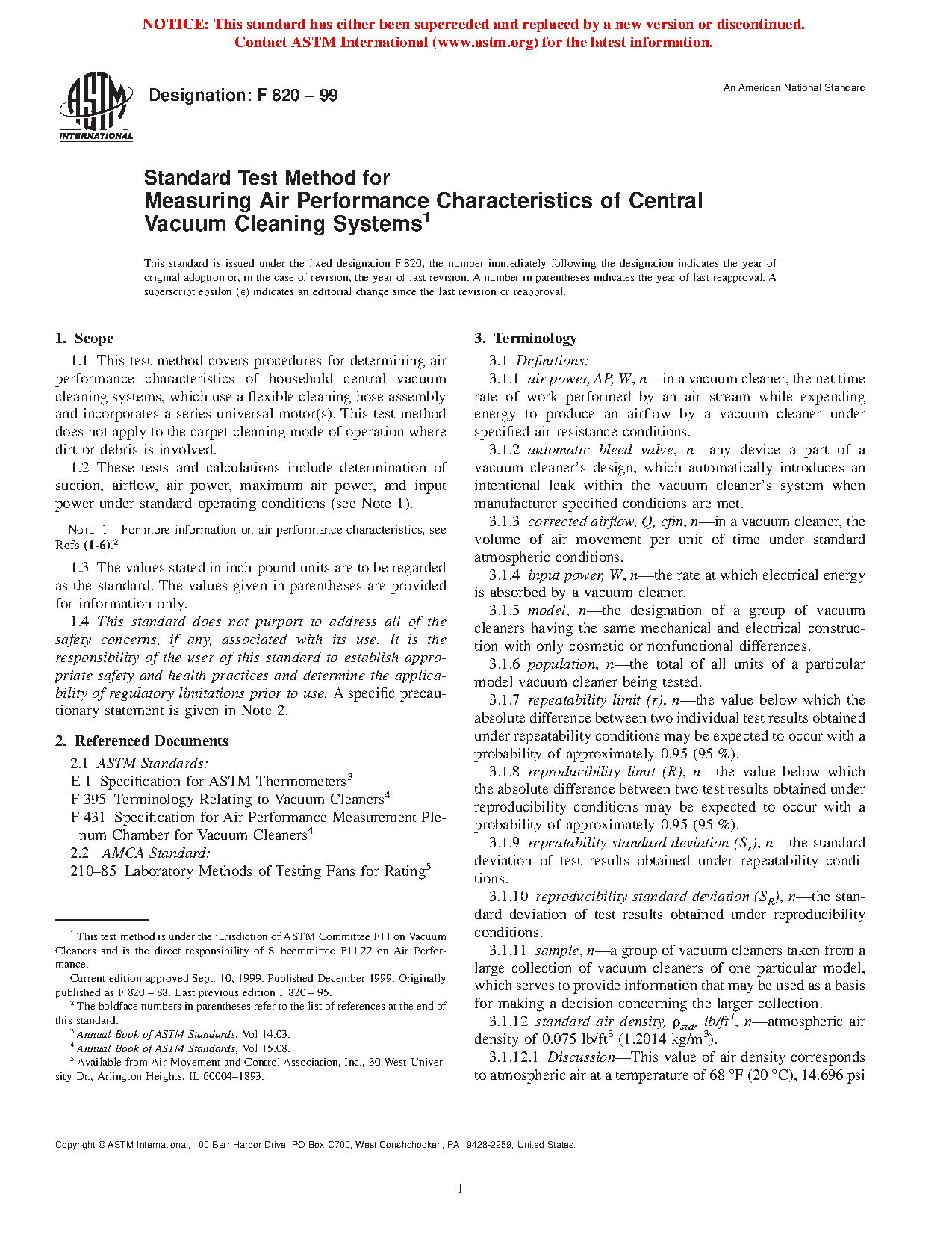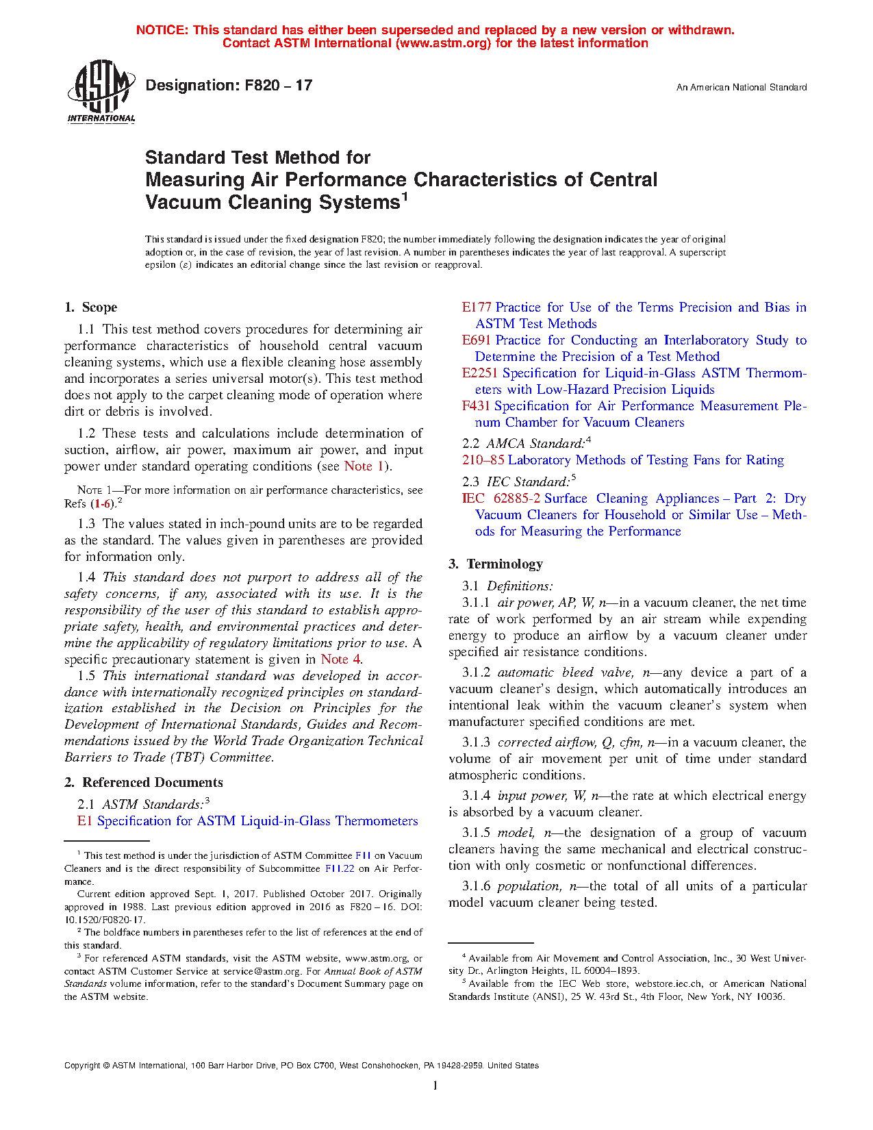 1.2 These tests and calculations include determination of suction, airflow, air power, maximum air power, and input power under standard operating conditions (see Note 1).