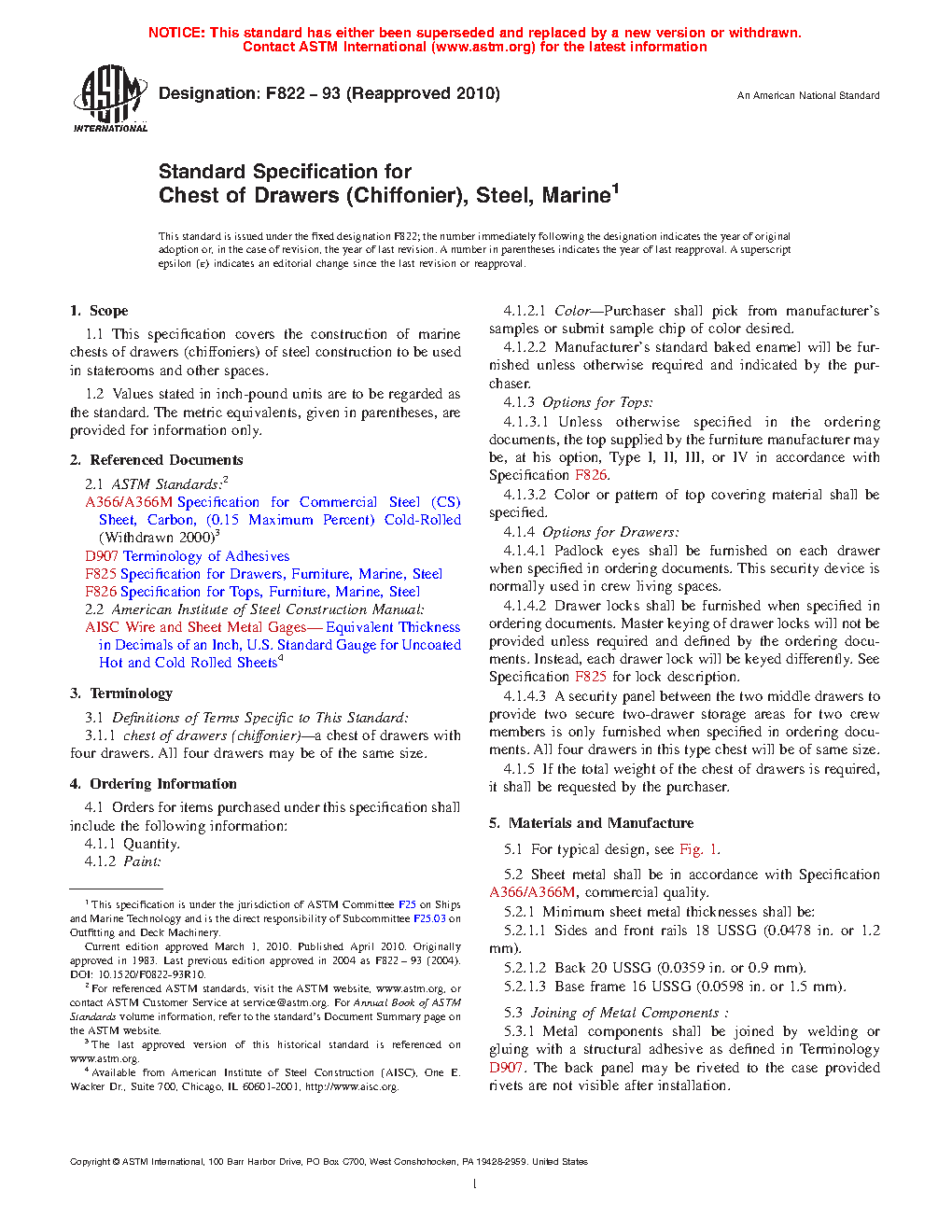 Standard Specification for Chest of Drawers (Chiffonier), Steel, Marine