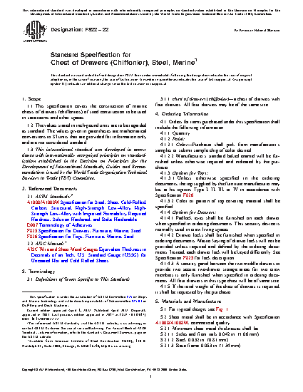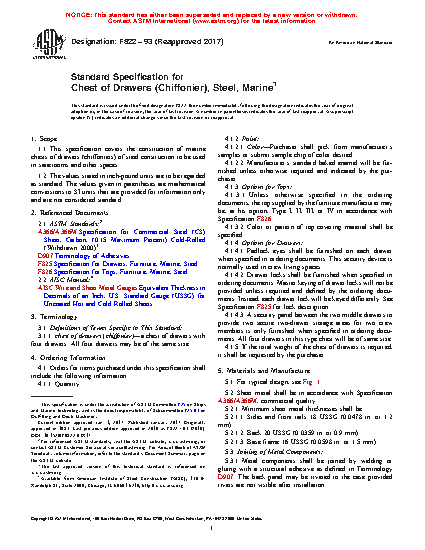 1.1 This specification covers the construction of marine chests of drawers (chiffoniers) of steel construction to be used in staterooms and other spaces.