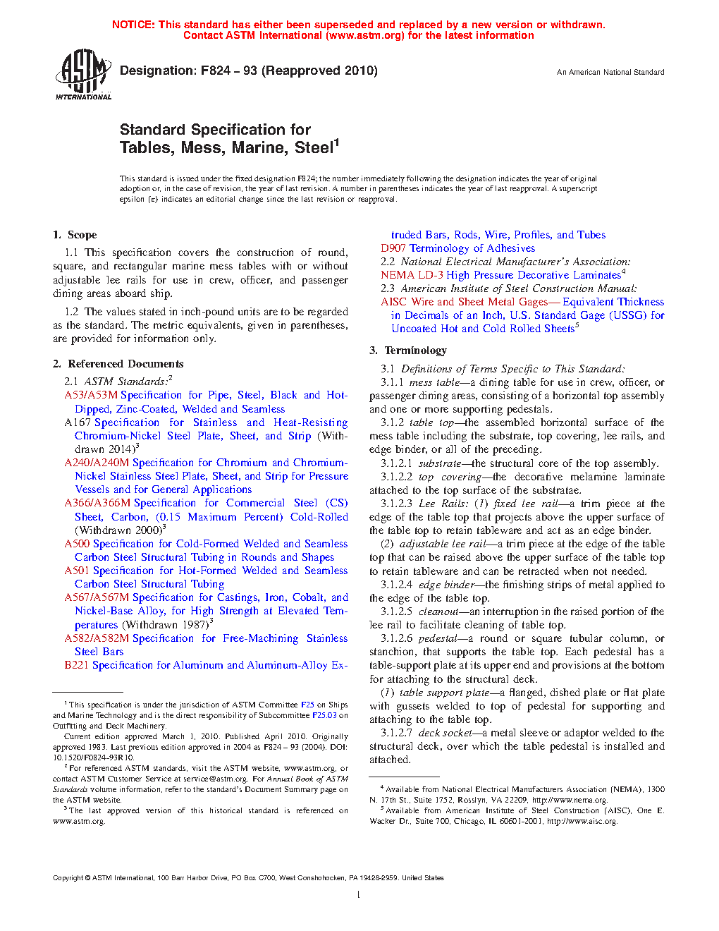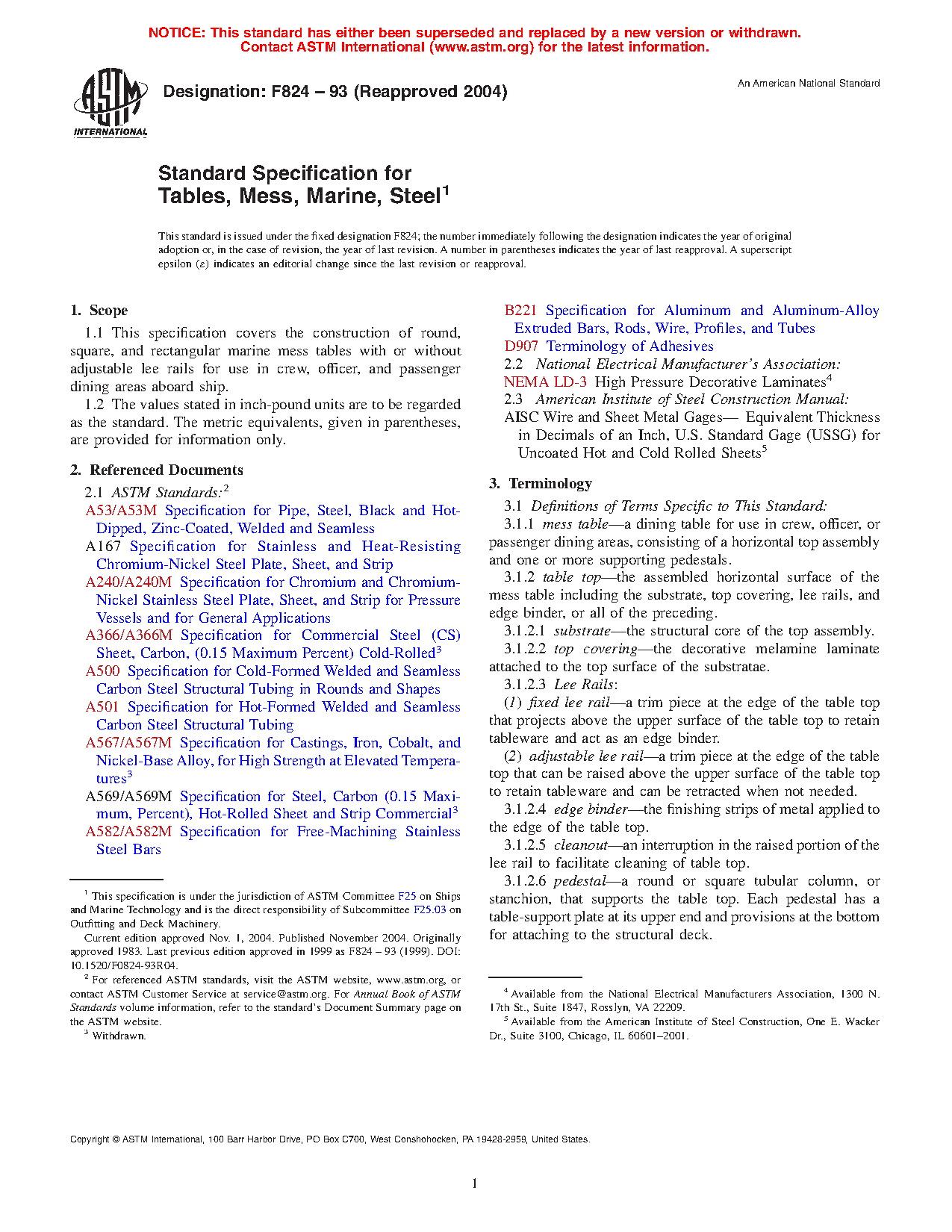 1.1 This specification covers the construction of round, square, and rectangular marine mess tables with or without adjustable lee rails for use in crew, officer, and passenger dining areas aboard ship.
