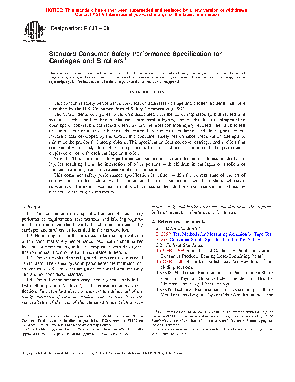 1.1 This consumer safety specification establishes safety performance requirements, test methods, and requirements for labeling to minimize the hazards to children presented by carriages and strollers as identified in the introduction.