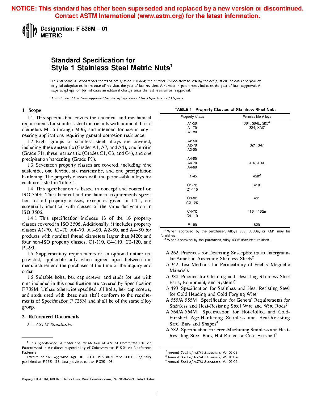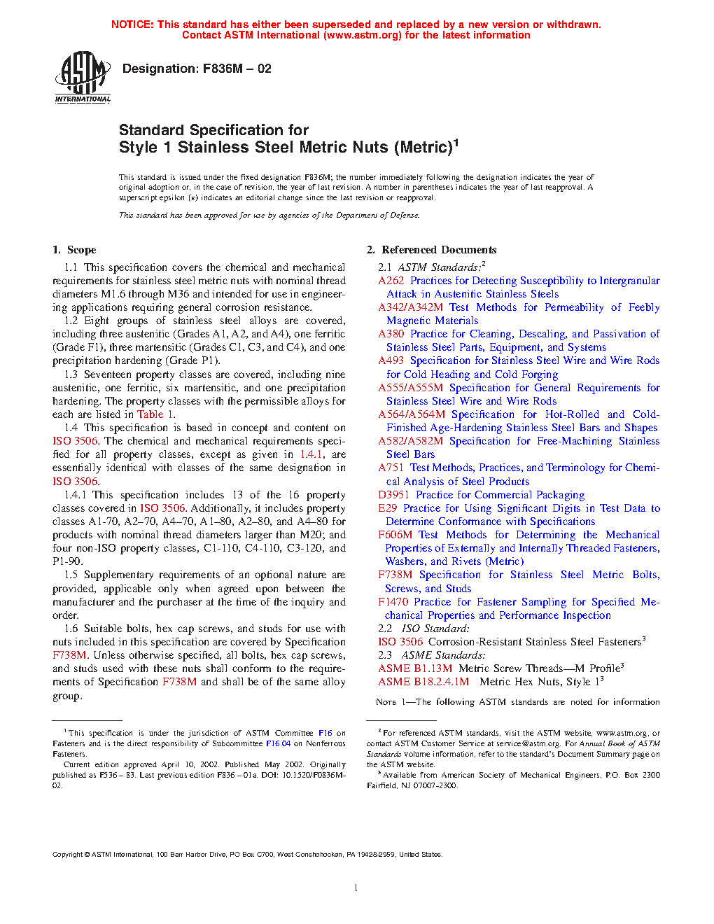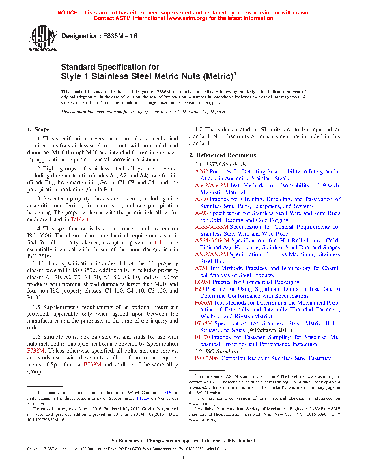 1.1 This specification covers the chemical and mechanical requirements for stainless steel metric nuts with nominal thread diameters M1.6 through M36 and intended for use in engineering applications requiring general corrosion resistance.