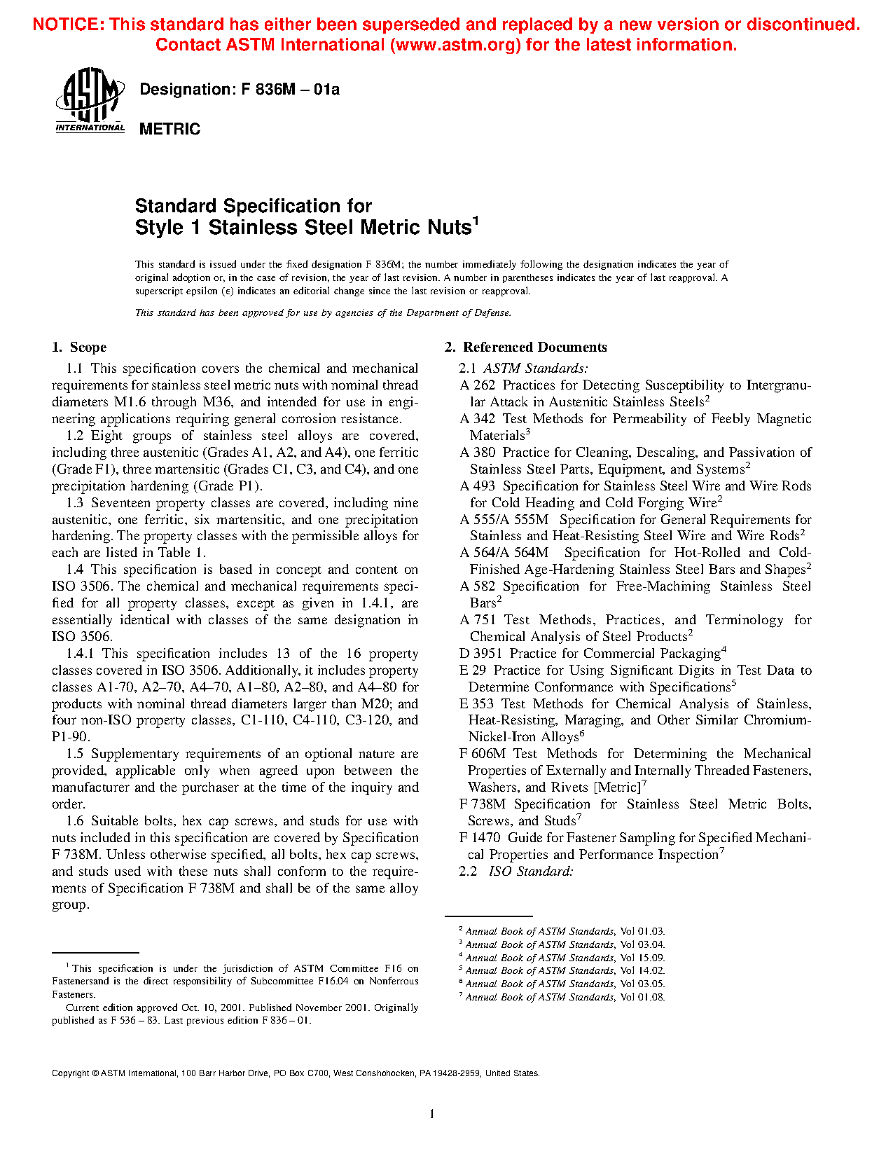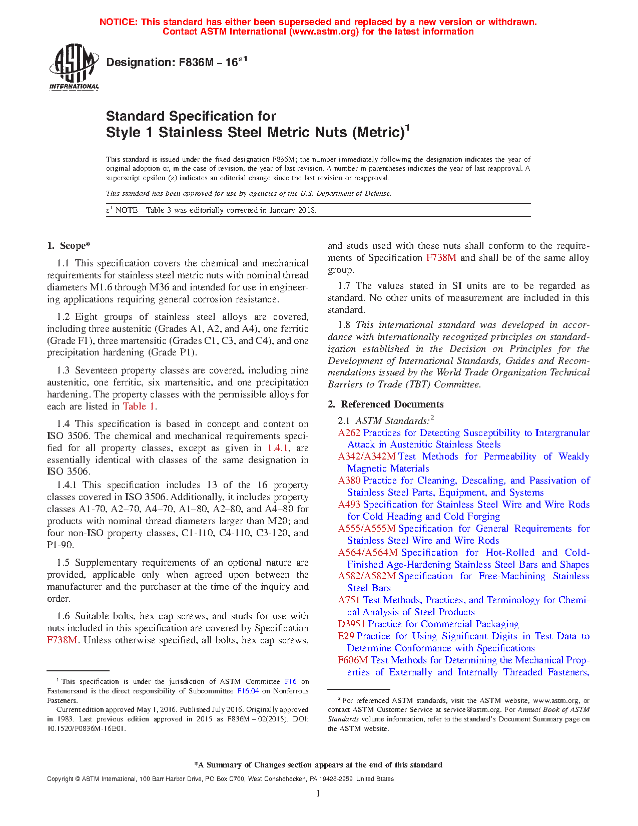 1.1 This specification covers the chemical and mechanical requirements for stainless steel metric nuts with nominal thread diameters M1.6 through M36 and intended for use in engineering applications requiring general corrosion resistance.