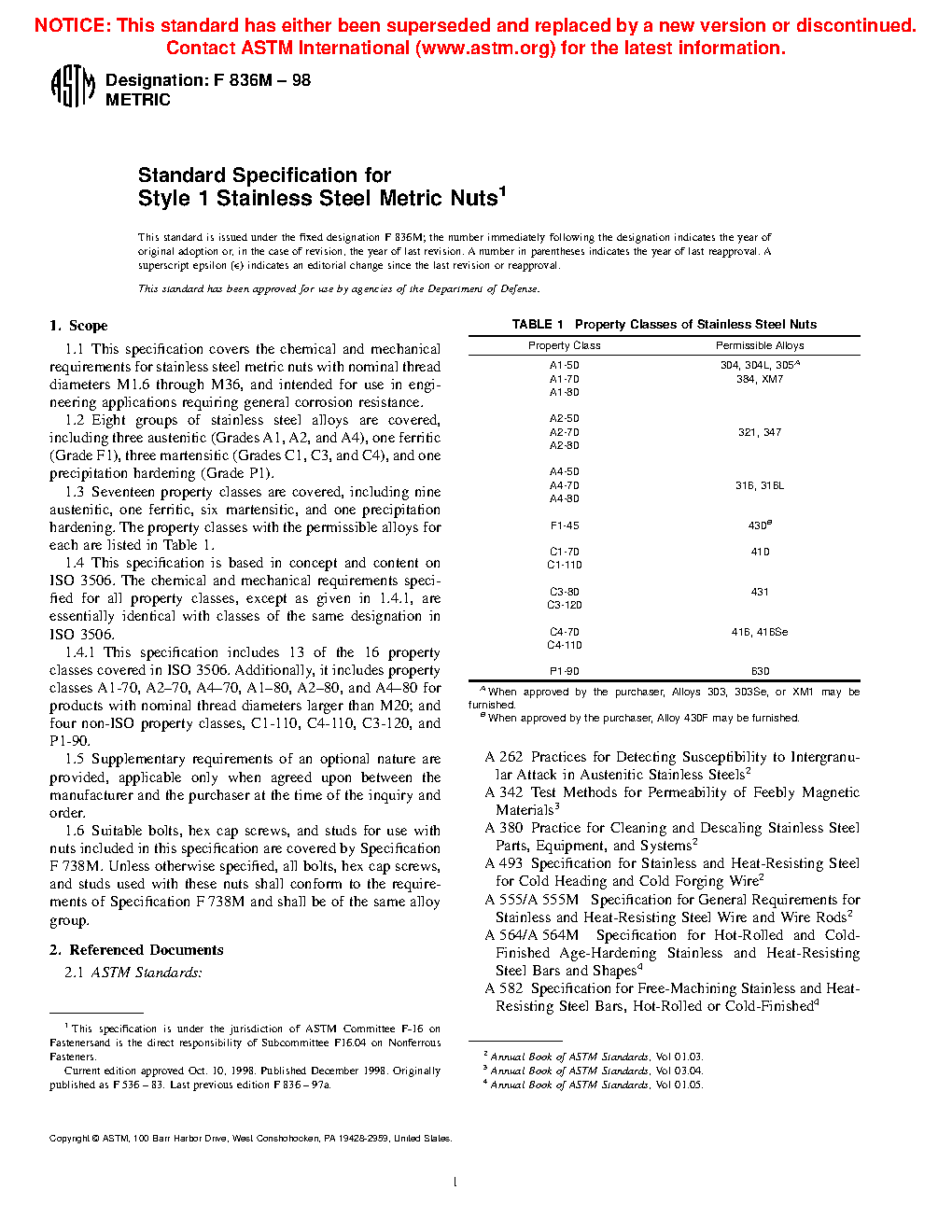 1.4.1 This specification includes 13 of the 16 property classes covered in ISO 3506. Additionally, it includes property classes A1-70, A2–70, A4–70, A1–80, A2–80, and A4–80 for products with nominal thread diameters larger than M20; and four non-ISO property classes, C1-110, C4-110, C3-120, and P1-90.