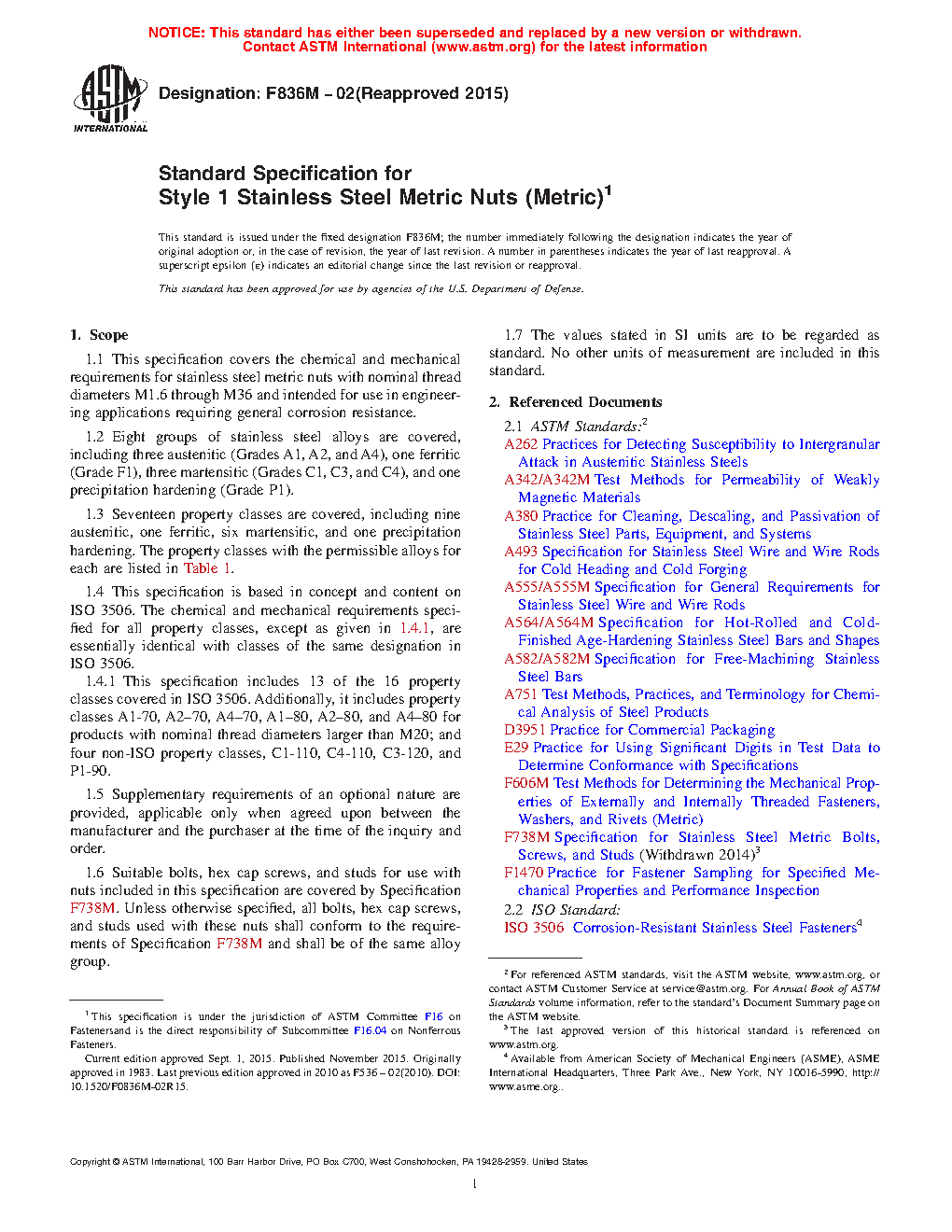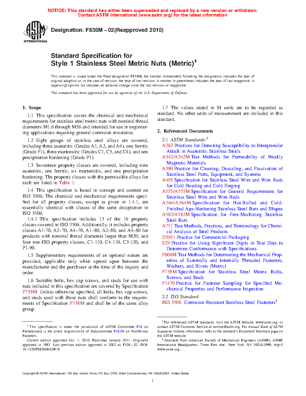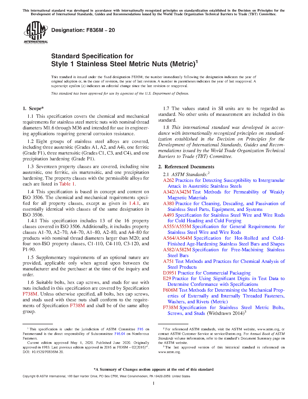 1.1 This specification covers the chemical and mechanical requirements for stainless steel metric nuts with nominal thread diameters M1.6 through M36 and intended for use in engineering applications requiring general corrosion resistance.