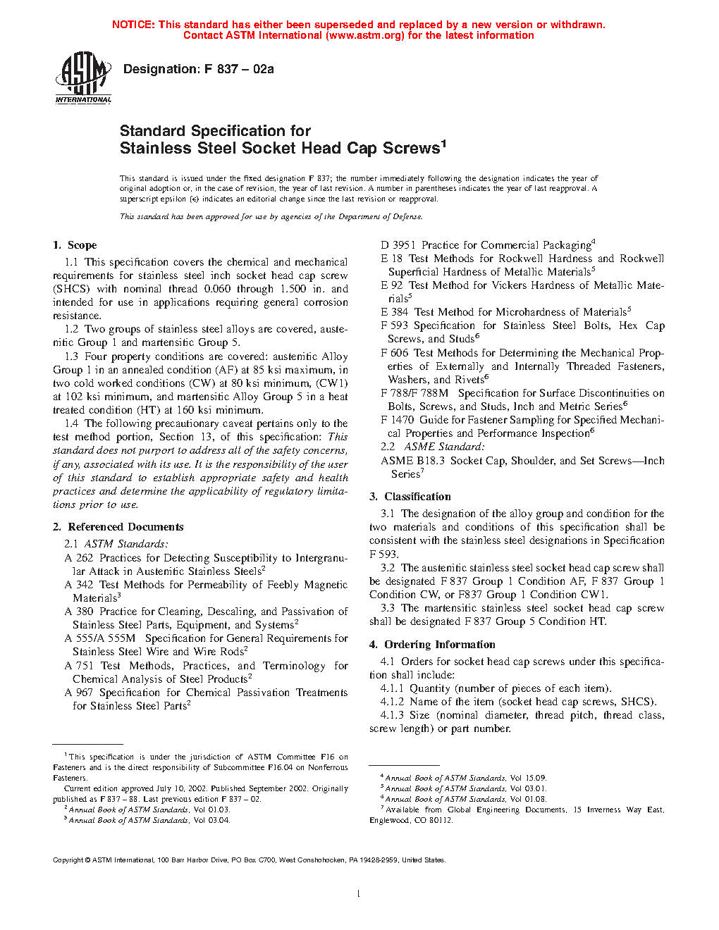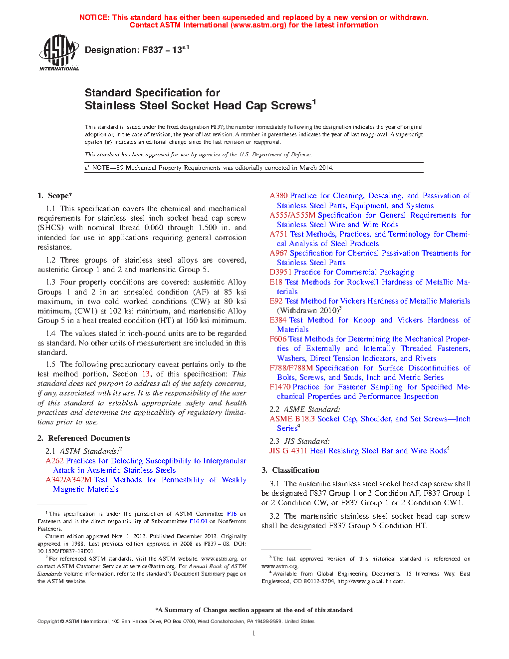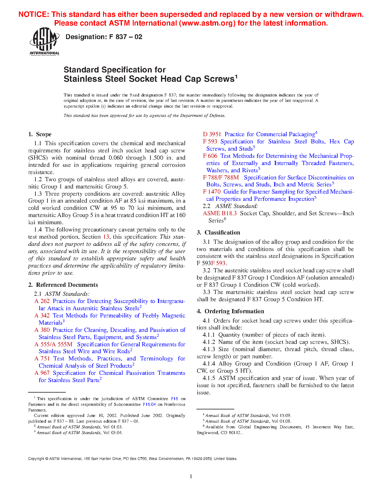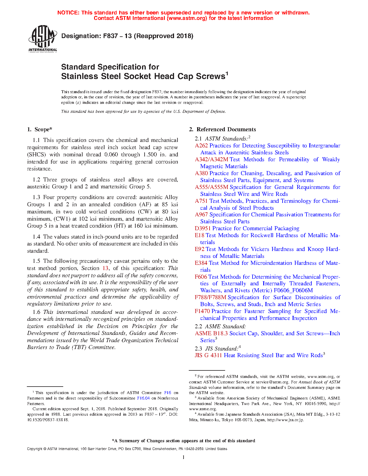 1.1 This specification covers the chemical and mechanical requirements for stainless steel inch socket head cap screw (SHCS) with nominal thread 0.060 through 1.500 in. and intended for use in applications requiring general corrosion resistance.