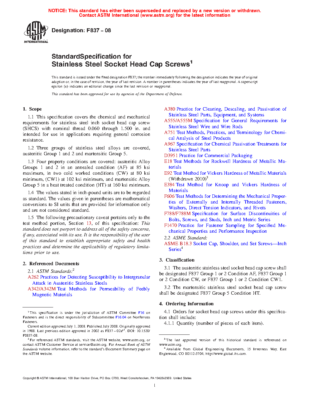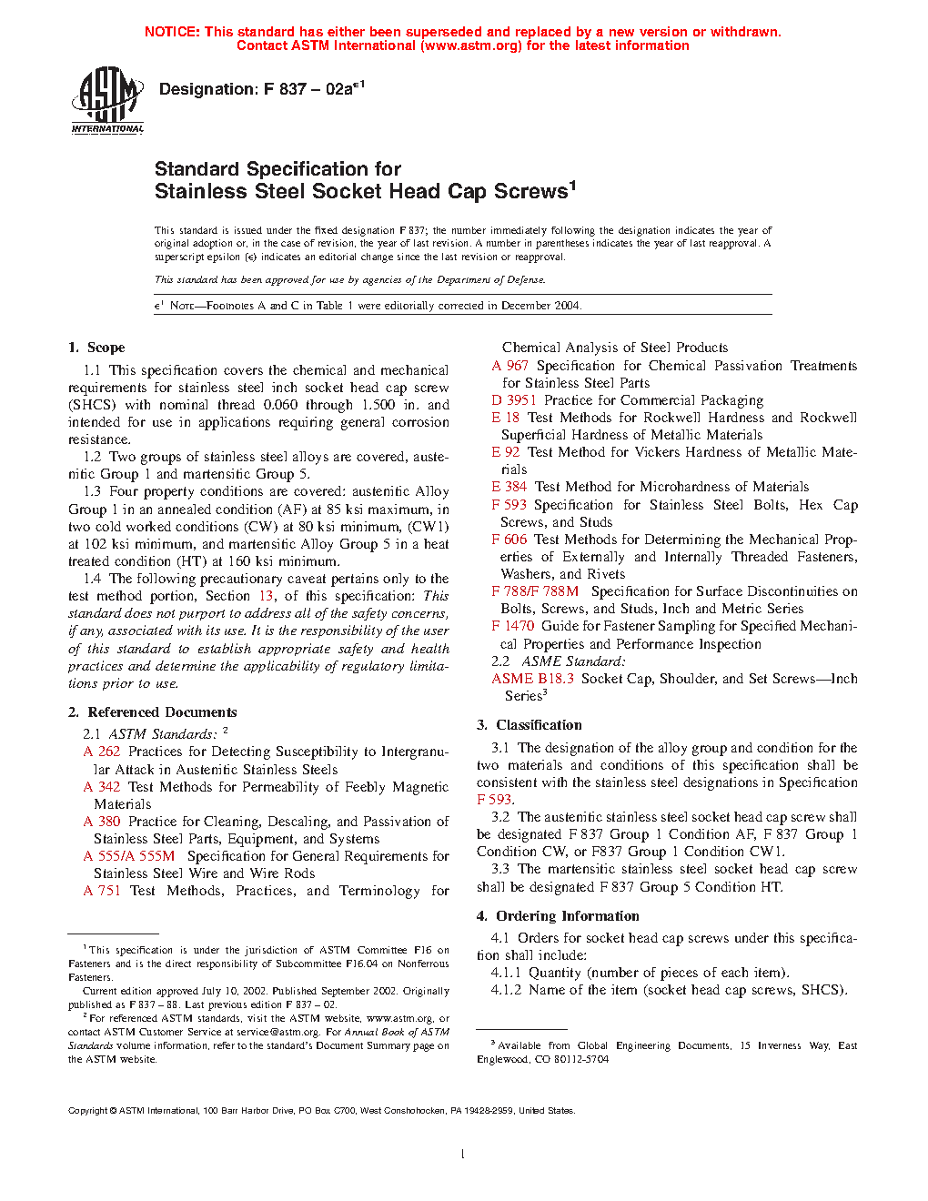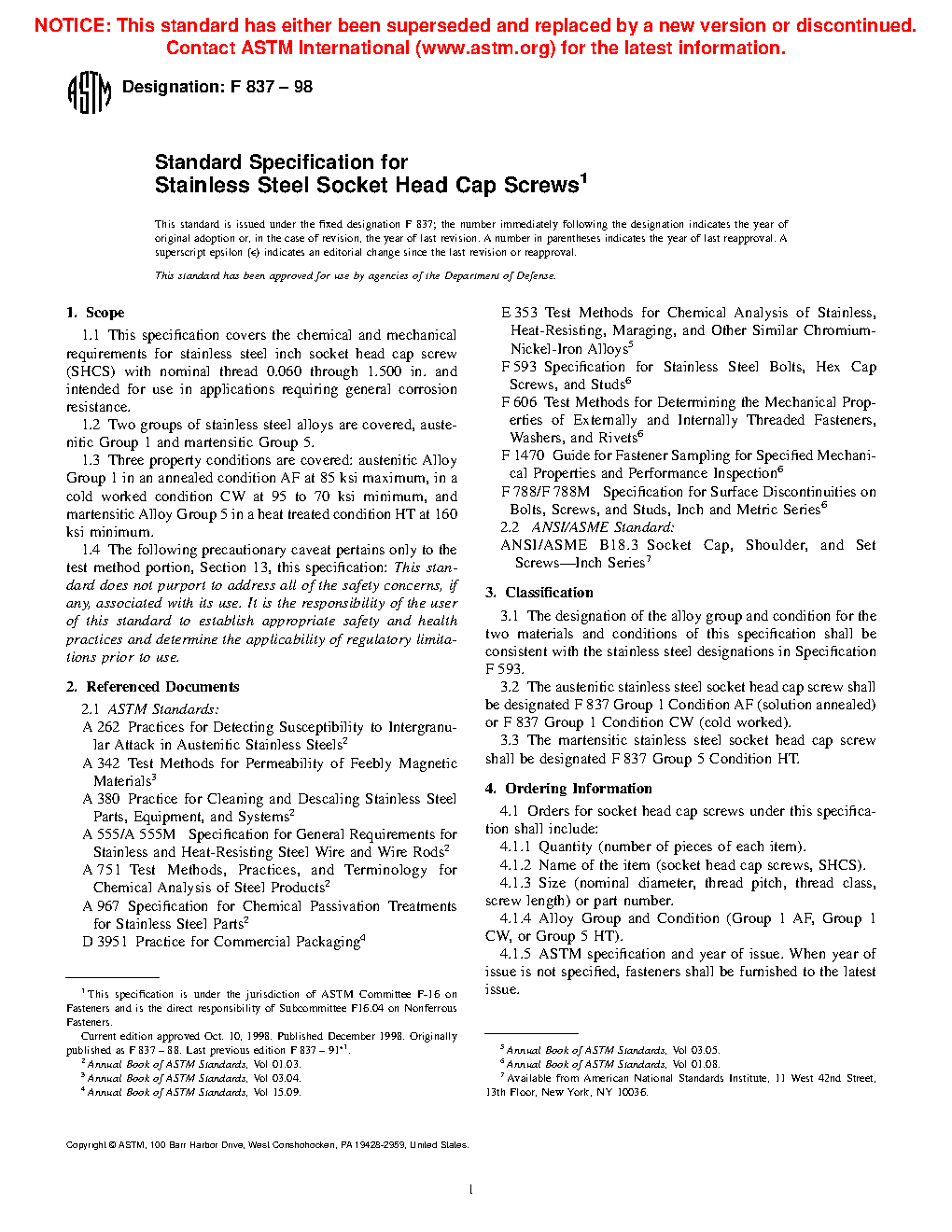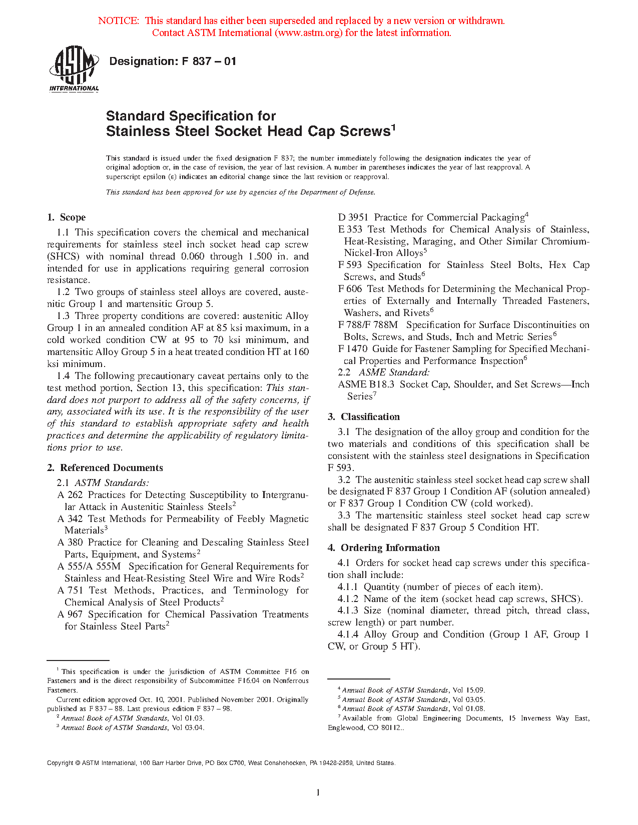 1.1 This specification covers the chemical and mechanical requirements for stainless steel inch socket head cap screw (SHCS) with nominal thread 0.060 through 1.500 in. and intended for use in applications requiring general corrosion resistance.