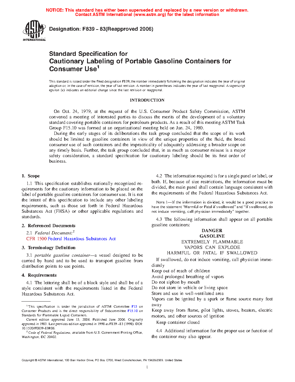 This specification establishes the nationally recognized requirements for the cautionary information to be placed on the label of portable gasoline containers for consumer use. These containers are designed to be carried by hand and are used to transport gasoline from points of distribution to points of use. This specification does not address any other labeling requirements, such as those set forth in Federal Hazardous Substances Act (FHSA) or other applicable regulations and standards.