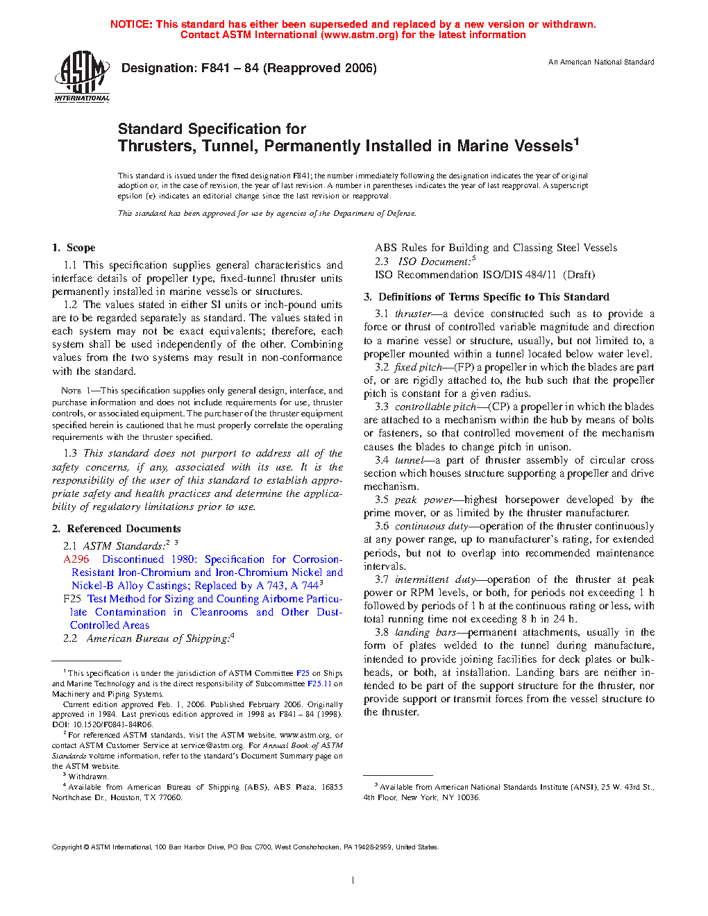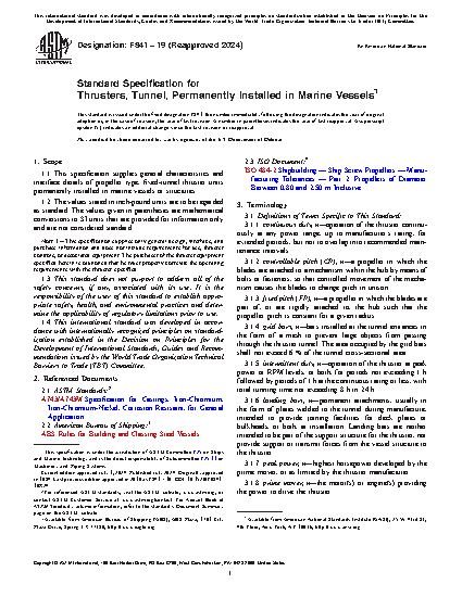 This specification supplies the general characteristics and requirements, and interface details of propeller-type, fixed-tunnel thruster units that are permanently installed in marine vessels or structures. Thrusters manufactured in accordance with this specification shall be identified by the following types and grades: Type I—fixed pitch; and Type II—controllable pitch; Grade 1—intermittent duty for docking and navigation; and Grade 2—continuous duty for stationkeeping or dynamic positioning. The thrusters shall meet the design, manufacturing, dimensional, and workmanship requirements specified herein.