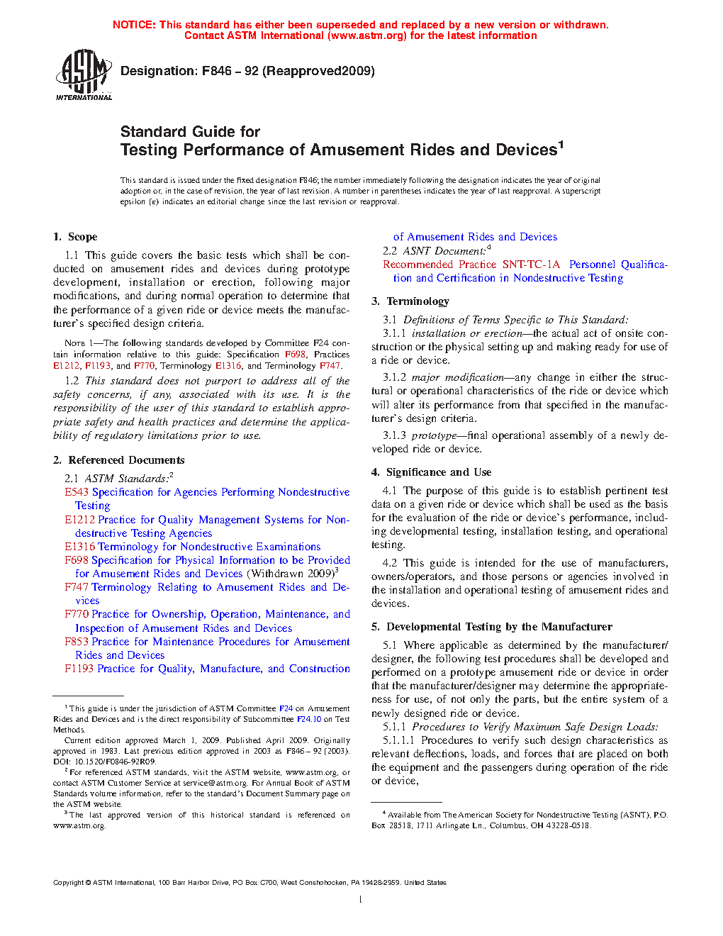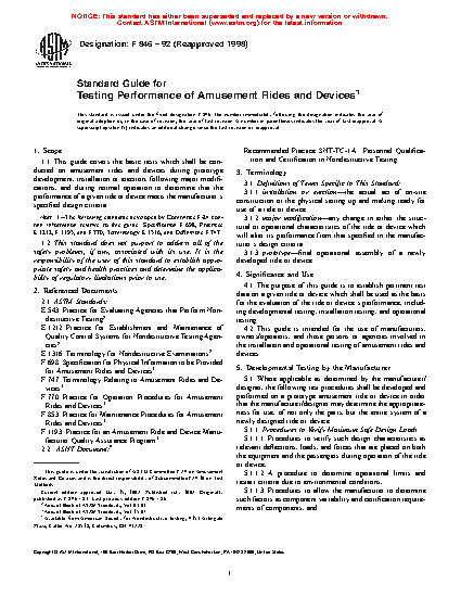 The purpose of this guide is to establish pertinent test data on a given ride or device which shall be used as the basis for the evaluation of the ride or device’performance, including developmental testing, installation testing, and operational testing.